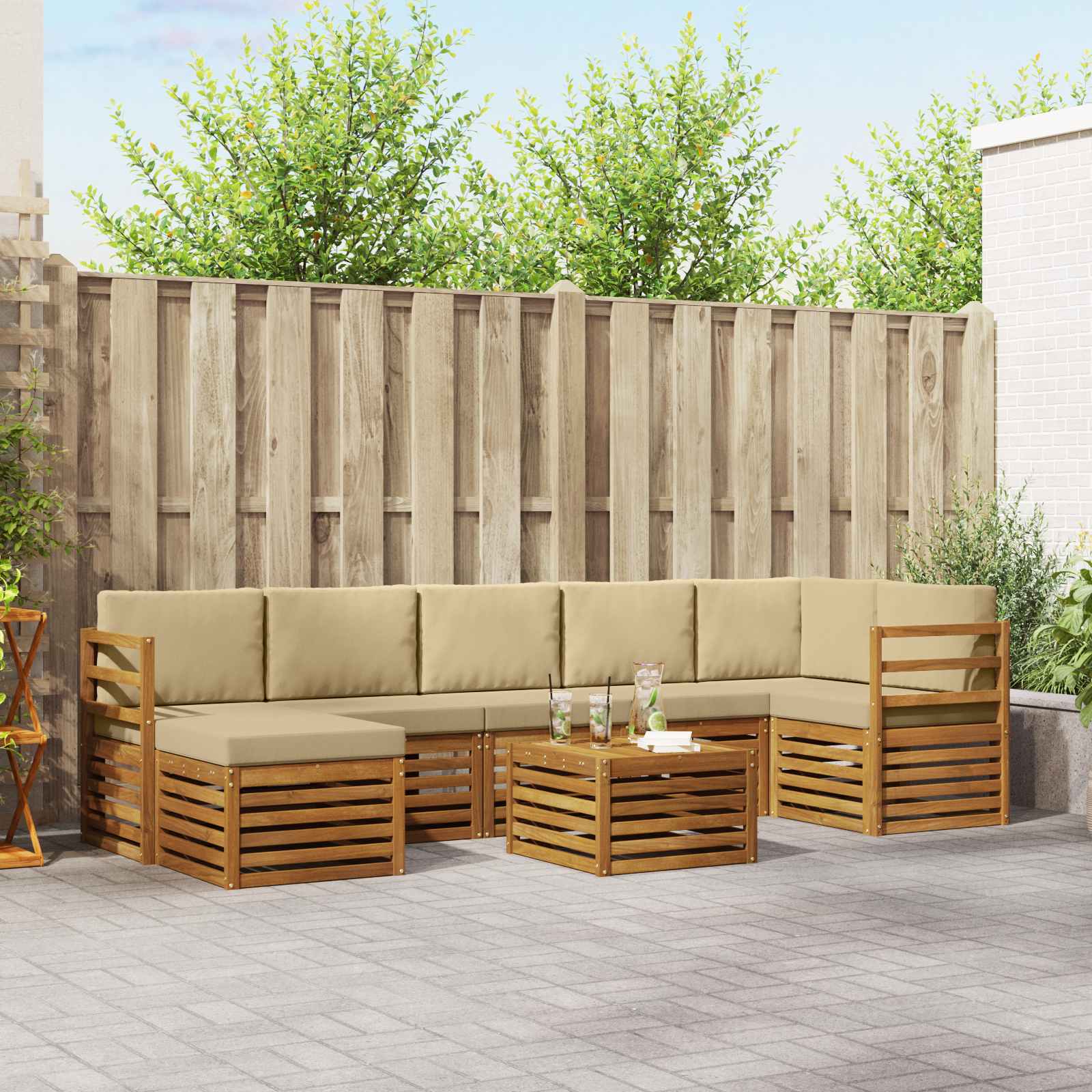 Das Outdoor-Möbelset bringt Stil und Funktion zusammen und ist ein echtes Highlight für jeden Garten oder jede Terrasse. Das moderne Design mit klaren Linien und minimalistischen Details verleiht deinem Außenbereich Eleganz und schafft gleichzeitig eine gemütliche Atmosphäre für Entspannung und gesellige Zusammenkünfte. Hergestellt aus massivem Akazienholz, garantiert das Set Langlebigkeit und bleibt optisch ansprechend – die perfekte Wahl für all jene, die praktische und schicke Gartenmöbel suchen. Robustes Massivholz Akazie: Dieses Outdoor-Möbelset aus massivem Akazienholz ist langlebig und widerstandsfähig gegen Witterungseinflüsse. Es sorgt für Stabilität und ist eine Bereicherung für jeden Garten oder jede Terasse. Wetterfeste Verarbeitung: Mit einer lackierten Oberfläche bietet das Set zusätzlichen Schutz vor Sonne, leichtem Regen und anderen Witterungsbedingungen. Der glänzende Look bleibt erhalten und sorgt dafür, dass die Möbel deine Terrasse oder deinen Garten optimal ergänzen. Stylisches Design: Jedes Element, von den Armlehnen bis zu den Rückenlehnen, ist sowohl stylisch als auch funktional gestaltet. Unterstützende Features sorgen für zusätzlichen Komfort, während das harmonische Design ein einladendes Gesamtbild für verschiedene Outdoor-Anlässe schafft. Komfort & Flexibilität: Das modulare Design ermöglicht dir, die Möbel nach Bedarf umzustellen. Perfekt zum Entspannen oder für gesellige Treffen – dieses Set passt sich jeder Outdoor-Situation an und maximiert den Komfort. Einfache Pflege: Um die Möbel gut in Schuss zu halten, wisch einfach mit einem feuchten Tuch über die Oberfläche und vermeide aggressive Reinigungsmittel. Regelmäßige Pflege hilft dabei, ihr Aussehen zu bewahren und die Lebensdauer der Möbel zu verlängern.