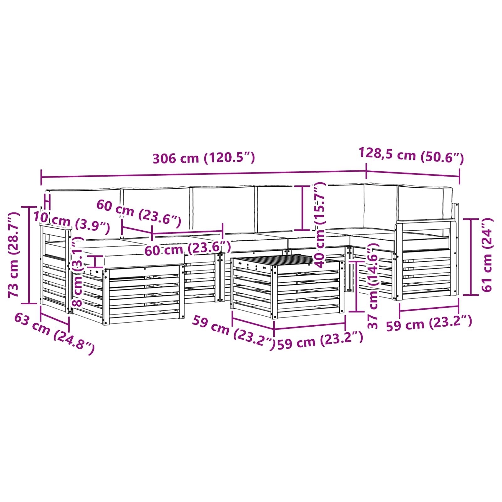 - 7 x Sitzkissen: 60 x 60 x 8 cm (LxBxH)