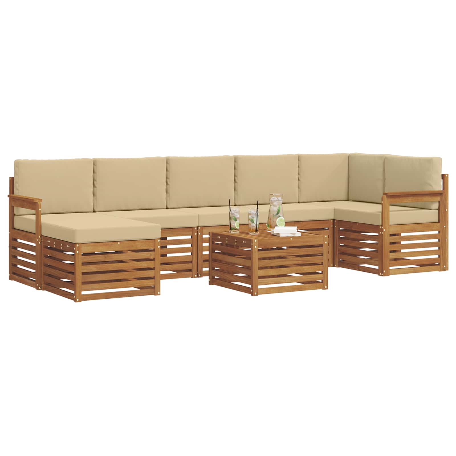 Das Outdoor-Möbelset bringt Stil und Funktion zusammen und ist ein echtes Highlight für jeden Garten oder jede Terrasse. Das moderne Design mit klaren Linien und minimalistischen Details verleiht deinem Außenbereich Eleganz und schafft gleichzeitig eine gemütliche Atmosphäre für Entspannung und gesellige Zusammenkünfte. Hergestellt aus massivem Akazienholz, garantiert das Set Langlebigkeit und bleibt optisch ansprechend – die perfekte Wahl für all jene, die praktische und schicke Gartenmöbel suchen. Robustes Massivholz Akazie: Dieses Outdoor-Möbelset aus massivem Akazienholz ist langlebig und widerstandsfähig gegen Witterungseinflüsse. Es sorgt für Stabilität und ist eine Bereicherung für jeden Garten oder jede Terasse. Wetterfeste Verarbeitung: Mit einer lackierten Oberfläche bietet das Set zusätzlichen Schutz vor Sonne, leichtem Regen und anderen Witterungsbedingungen. Der glänzende Look bleibt erhalten und sorgt dafür, dass die Möbel deine Terrasse oder deinen Garten optimal ergänzen. Stylisches Design: Jedes Element, von den Armlehnen bis zu den Rückenlehnen, ist sowohl stylisch als auch funktional gestaltet. Unterstützende Features sorgen für zusätzlichen Komfort, während das harmonische Design ein einladendes Gesamtbild für verschiedene Outdoor-Anlässe schafft. Komfort & Flexibilität: Das modulare Design ermöglicht dir, die Möbel nach Bedarf umzustellen. Perfekt zum Entspannen oder für gesellige Treffen – dieses Set passt sich jeder Outdoor-Situation an und maximiert den Komfort. Einfache Pflege: Um die Möbel gut in Schuss zu halten, wisch einfach mit einem feuchten Tuch über die Oberfläche und vermeide aggressive Reinigungsmittel. Regelmäßige Pflege hilft dabei, ihr Aussehen zu bewahren und die Lebensdauer der Möbel zu verlängern.