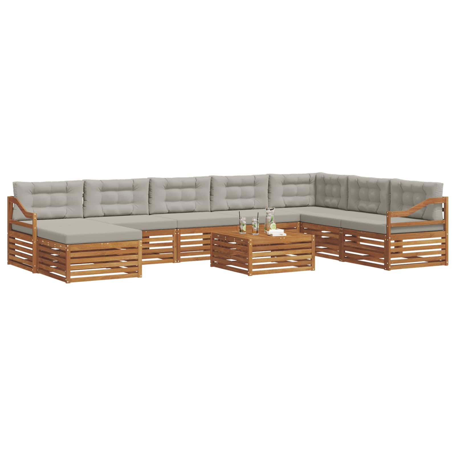 Das modulare Sofa-Set für den Außenbereich ist ein echter Blickfang, der jeden Garten, jede Terrasse oder jeden Poolbereich aufpeppen kann. Mit seinem modernen, einfachen Stil bringt es Klarheit und eine schlichte Ästhetik, die perfekt zum Entspannen oder für gesellige Abende geeignet sind. Die schicke braune Farbe fügt sich nahtlos in die Umgebung ein und bietet ausreichend Platz für gemeinsame gemütliche Stunden mit Familie und Freunden. Materialkonstruktion: Hergestellt aus solidem Akazienholz bringt dieses Sofa-Set Langlebigkeit und verleiht jedem Außenbereich eine schöne, natürliche Note. Die dichte Holzmaserung sorgt für eine warme, einladende Atmosphäre, während die natürlichen Öle das Holz vor Schädlingen schützen und für eine lange Nutzungsdauer sorgen. Modernes Design: Mit schlichten Linien und minimalistisch gehalten, passt es perfekt in moderne Außenbereiche. Der warme Braunton harmoniert schön mit grünen Pflanzen und macht es zu einer tollen Wahl für jeden Garten. Die modulare Bauweise lässt sich ganz einfach an deine Platz- und Sitzwünsche anpassen. Komfortmerkmale: Der Akazienholz-Sitz und die Kissen aus 100% Polyester sorgen zusammen für eine bequeme und einladende Fläche zum Relaxen. Der Stoff ist weich, robust und leicht zu pflegen, was für jede Menge Komfort beim Entspannen draußen sorgt. Komponentenintegration: Die stabilen Armlehnen und der Lattenrücken sorgen für ergonomisches Sitzen und extra Unterstützung, perfekt für lange, entspannte Nachmittage. Einfache Pflege: Halte das Sofa-Set schnell und einfach sauber – ein feuchtes Tuch reicht, um Staub und Schmutz zu entfernen. So bleibt es immer in Topform und sorgt für frischen Look das ganze Jahr über.