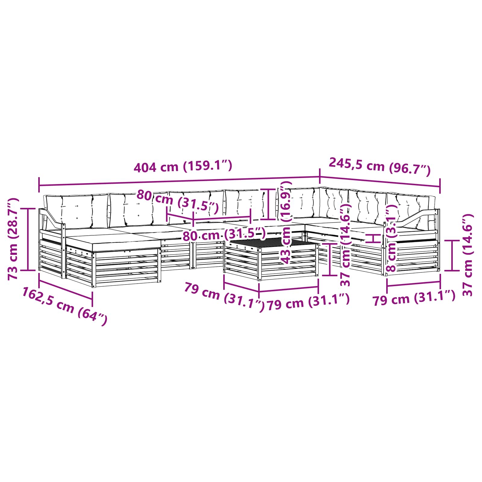 - 8 x Sitzkissen: 80 x 80 x 8 cm (L x B x H)