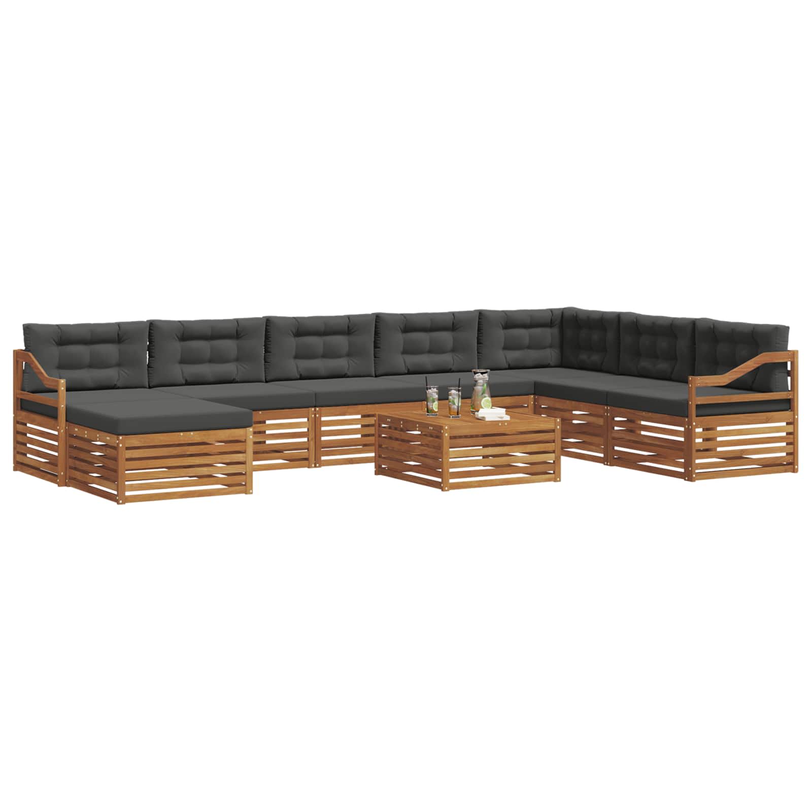 Das modulare Sofa-Set für den Außenbereich ist ein echter Blickfang, der jeden Garten, jede Terrasse oder jeden Poolbereich aufpeppen kann. Mit seinem modernen, einfachen Stil bringt es Klarheit und eine schlichte Ästhetik, die perfekt zum Entspannen oder für gesellige Abende geeignet sind. Die schicke braune Farbe fügt sich nahtlos in die Umgebung ein und bietet ausreichend Platz für gemeinsame gemütliche Stunden mit Familie und Freunden. Materialkonstruktion: Hergestellt aus solidem Akazienholz bringt dieses Sofa-Set Langlebigkeit und verleiht jedem Außenbereich eine schöne, natürliche Note. Die dichte Holzmaserung sorgt für eine warme, einladende Atmosphäre, während die natürlichen Öle das Holz vor Schädlingen schützen und für eine lange Nutzungsdauer sorgen. Modernes Design: Mit schlichten Linien und minimalistisch gehalten, passt es perfekt in moderne Außenbereiche. Der warme Braunton harmoniert schön mit grünen Pflanzen und macht es zu einer tollen Wahl für jeden Garten. Die modulare Bauweise lässt sich ganz einfach an deine Platz- und Sitzwünsche anpassen. Komfortmerkmale: Der Akazienholz-Sitz und die Kissen aus 100% Polyester sorgen zusammen für eine bequeme und einladende Fläche zum Relaxen. Der Stoff ist weich, robust und leicht zu pflegen, was für jede Menge Komfort beim Entspannen draußen sorgt. Komponentenintegration: Die stabilen Armlehnen und der Lattenrücken sorgen für ergonomisches Sitzen und extra Unterstützung, perfekt für lange, entspannte Nachmittage. Einfache Pflege: Halte das Sofa-Set schnell und einfach sauber – ein feuchtes Tuch reicht, um Staub und Schmutz zu entfernen. So bleibt es immer in Topform und sorgt für frischen Look das ganze Jahr über.