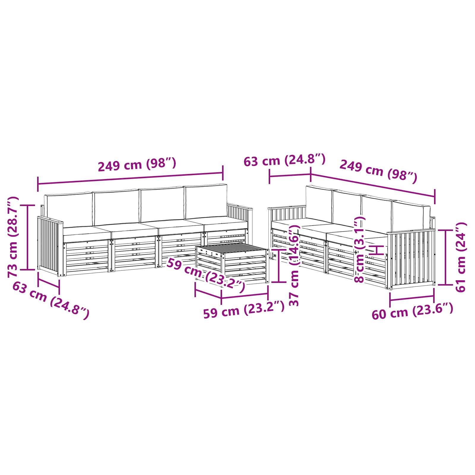 - 8 x Sitzkissen: 60 x 60 x 8 cm (LxBxH)