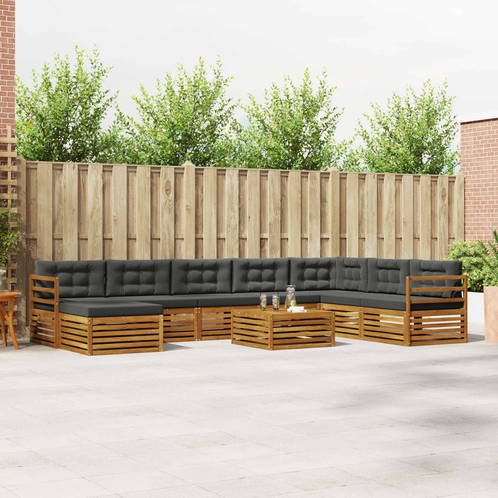 Das modulare Sofa-Set für den Außenbereich ist ein echter Blickfang, der jeden Garten, jede Terrasse oder jeden Poolbereich aufpeppen kann. Mit seinem modernen, einfachen Stil bringt es Klarheit und eine schlichte Ästhetik, die perfekt zum Entspannen oder für gesellige Abende geeignet sind. Die schicke braune Farbe fügt sich nahtlos in die Umgebung ein und bietet ausreichend Platz für gemeinsame gemütliche Stunden mit Familie und Freunden. Materialkonstruktion: Hergestellt aus solidem Akazienholz bringt dieses Sofa-Set Langlebigkeit und verleiht jedem Außenbereich eine schöne, natürliche Note. Die dichte Holzmaserung sorgt für eine warme, einladende Atmosphäre, während die natürlichen Öle das Holz vor Schädlingen schützen und für eine lange Nutzungsdauer sorgen. Modernes Design: Mit schlichten Linien und minimalistisch gehalten, passt es perfekt in moderne Außenbereiche. Der warme Braunton harmoniert schön mit grünen Pflanzen und macht es zu einer tollen Wahl für jeden Garten. Die modulare Bauweise lässt sich ganz einfach an deine Platz- und Sitzwünsche anpassen. Komfortmerkmale: Der Akazienholz-Sitz und die Kissen aus 100% Polyester sorgen zusammen für eine bequeme und einladende Fläche zum Relaxen. Der Stoff ist weich, robust und leicht zu pflegen, was für jede Menge Komfort beim Entspannen draußen sorgt. Komponentenintegration: Die stabilen Armlehnen und der Lattenrücken sorgen für ergonomisches Sitzen und extra Unterstützung, perfekt für lange, entspannte Nachmittage. Einfache Pflege: Halte das Sofa-Set schnell und einfach sauber – ein feuchtes Tuch reicht, um Staub und Schmutz zu entfernen. So bleibt es immer in Topform und sorgt für frischen Look das ganze Jahr über.