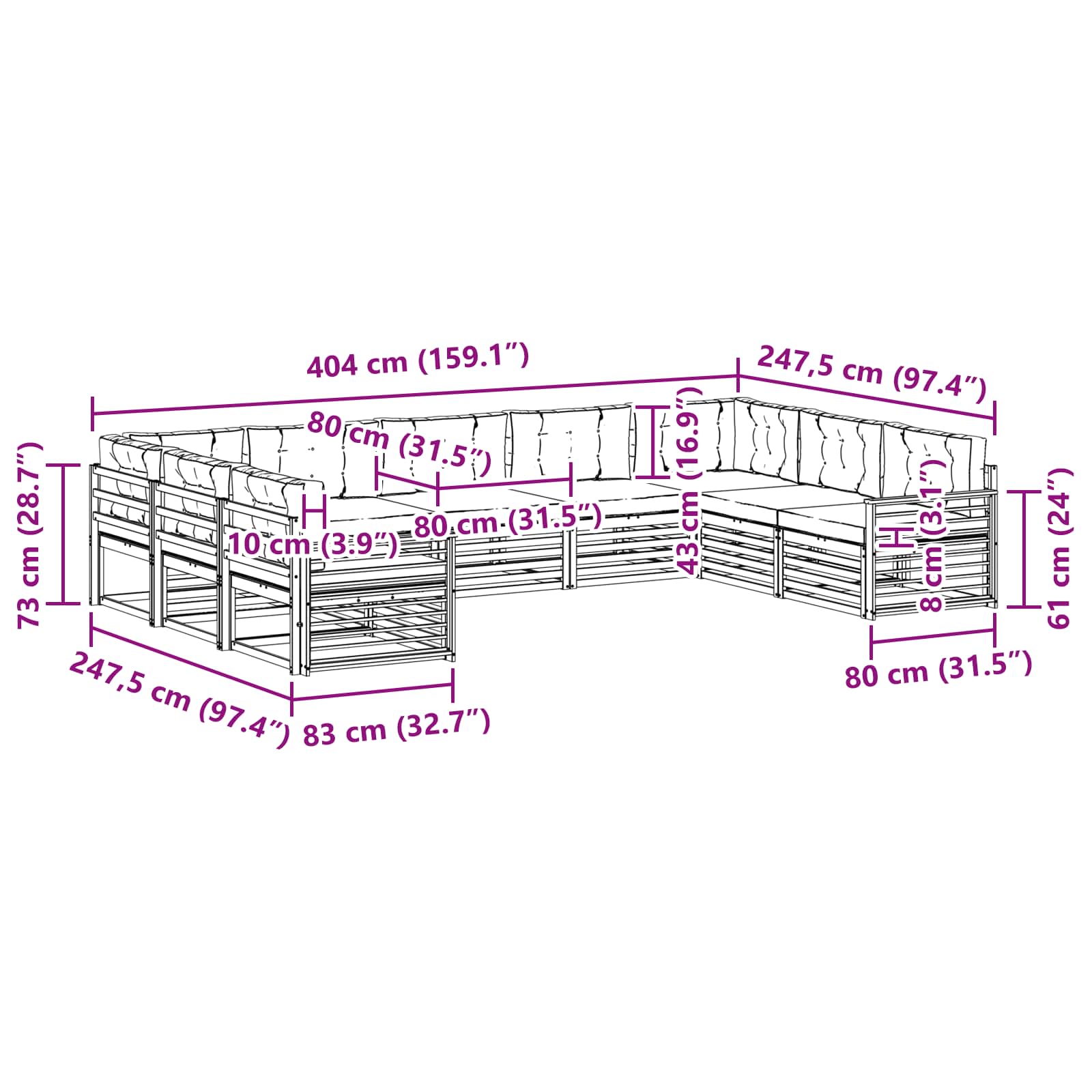 - 9 x Sitzkissen: 80 x 80 x 8 cm (LxBxH)