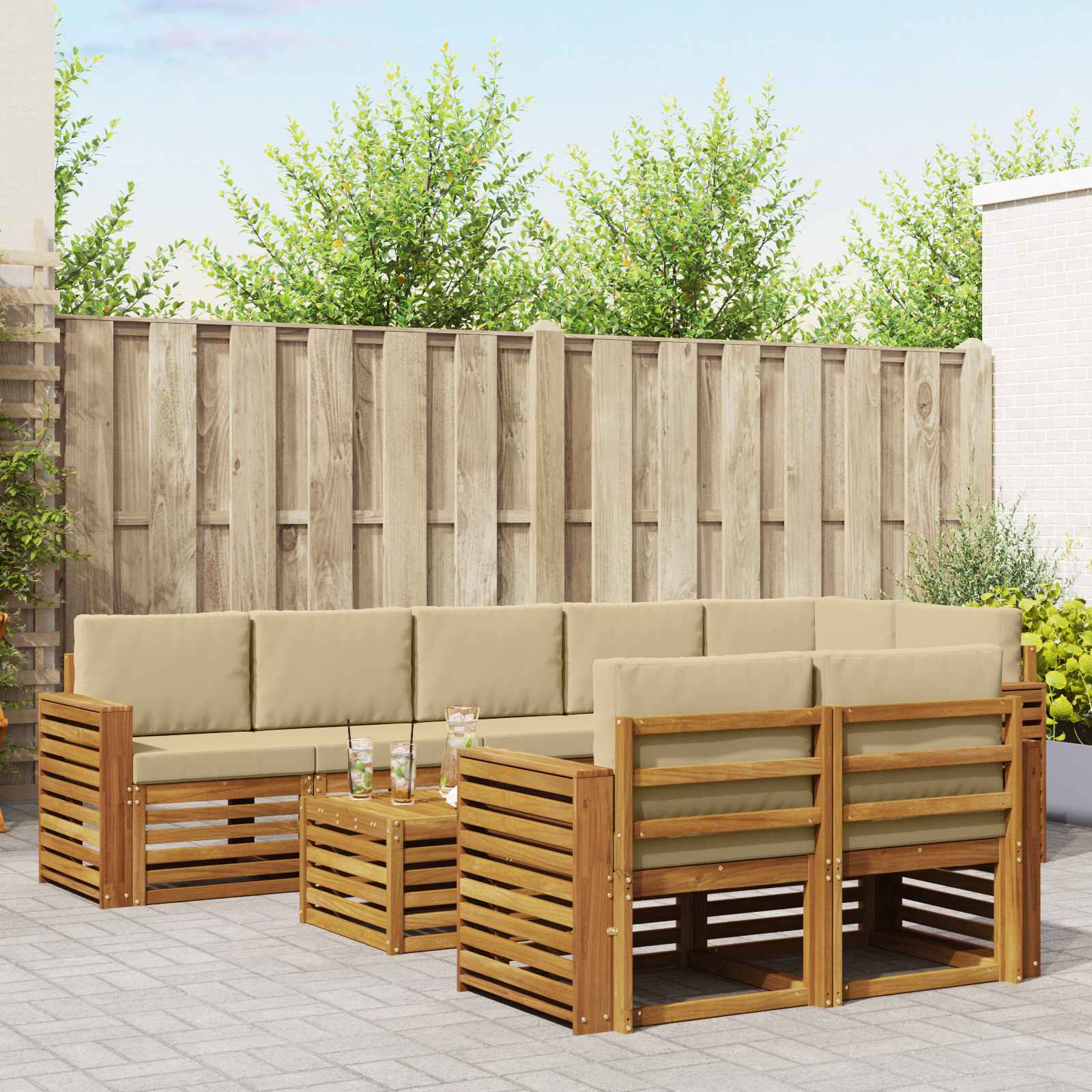 Dieses Sofaset für Garten, Terrasse oder Pool bringt modernes Design und Stil in deine Außenbereiche. Das schöne, braune Massivholz Akazie sorgt für eine angenehme Atmosphäre und macht es zum idealen Ort, um draußen zu relaxen oder sich mit Freunden zu treffen. Die modularen Teile lassen sich so anordnen, wie es dir am besten passt, und bieten dir die Flexibilität, die du brauchst. Robustes Akazienholz: Dieses Sofa aus Massivholz Akazie ist langlebig und stylish zugleich. Akazienholz ist dafür bekannt, witterungsbeständig zu sein und gibt deinem Garten oder deiner Terrasse ein zeitloses Flair. Modulares Design: Das Sofaset lässt sich ganz nach deinem Bedarf umstellen. Die flexible Gestaltung passt sich super an verschiedene Räume und Anlässe an. Einfache Wartung: Das praktische Design und die natürliche Oberfläche machen die Pflege kinderleicht. Du kannst das Sofa einfach mit einem feuchten Tuch abwischen - ganz ohne großen Aufwand. Modernes Design: Mit klaren Linien und minimalistischem Stil bringt dieses Sofa Eleganz und Nutzen in dein Zuhause. Die Schlichtheit sorgt dafür, dass es zu verschiedenen Außen-Dekoren passt. Funktionalität und Design: Das durchdachte Design sieht nicht nur gut aus, sondern sorgt auch dafür, dass das Sofa nach dem Regen schnell wieder trocken ist, was den Komfort erhöht.