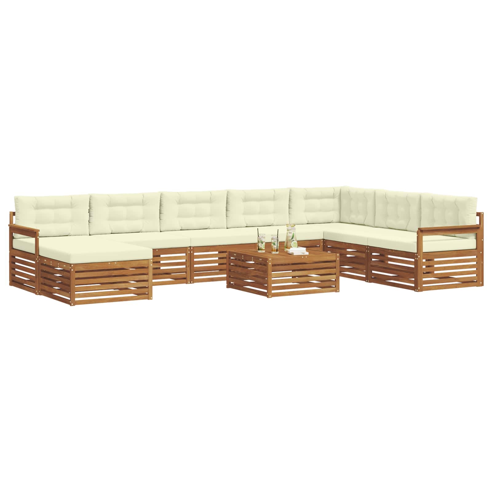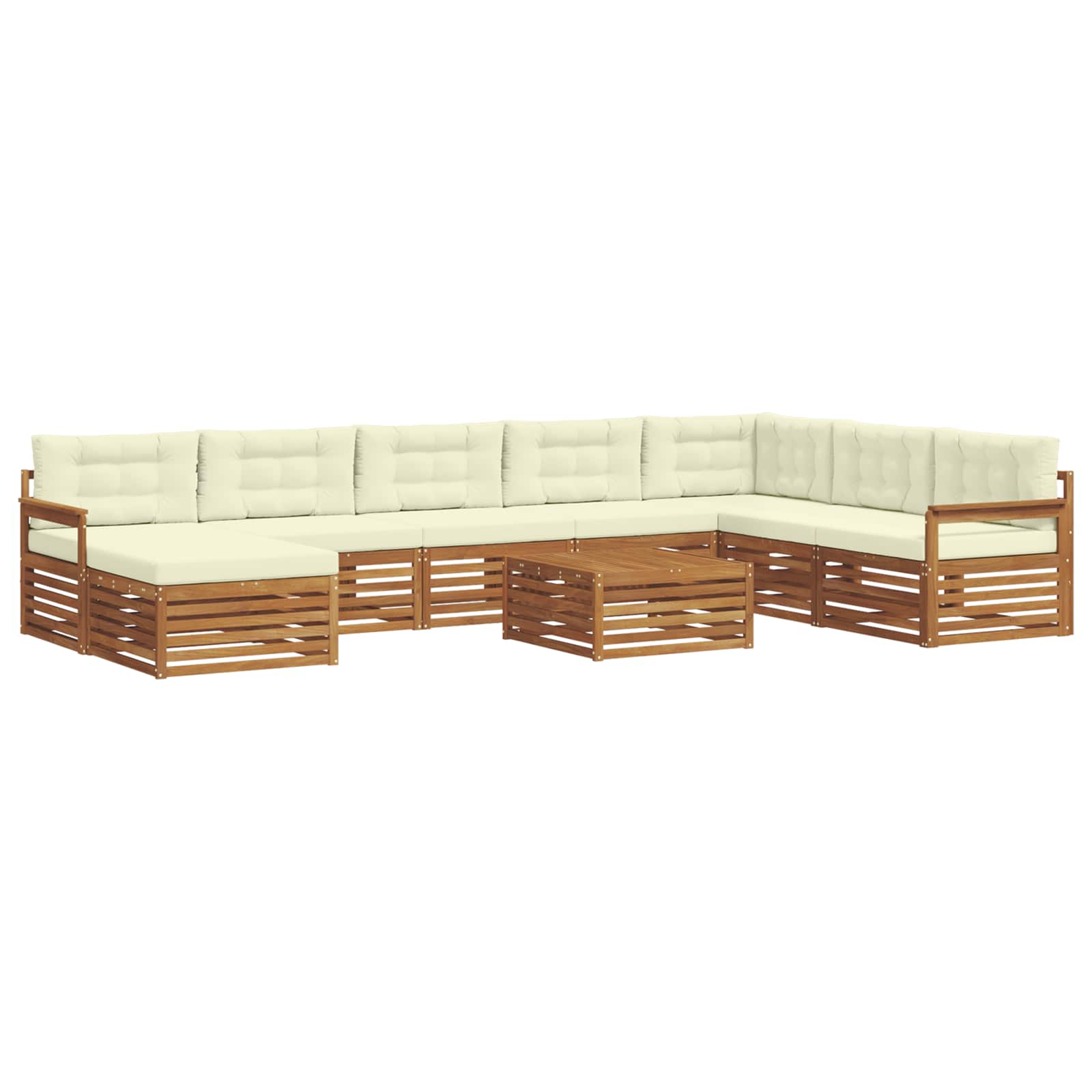 Das modulare Sofa-Set für den Außenbereich ist ein echter Blickfang, der jeden Garten, jede Terrasse oder jeden Poolbereich aufpeppen kann. Mit seinem modernen, einfachen Stil bringt es Klarheit und eine schlichte Ästhetik, die perfekt zum Entspannen oder für gesellige Abende geeignet sind. Die schicke braune Farbe fügt sich nahtlos in die Umgebung ein und bietet ausreichend Platz für gemeinsame gemütliche Stunden mit Familie und Freunden. Materialkonstruktion: Hergestellt aus solidem Akazienholz bringt dieses Sofa-Set Langlebigkeit und verleiht jedem Außenbereich eine schöne, natürliche Note. Die dichte Holzmaserung sorgt für eine warme, einladende Atmosphäre, während die natürlichen Öle das Holz vor Schädlingen schützen und für eine lange Nutzungsdauer sorgen. Modernes Design: Mit schlichten Linien und minimalistisch gehalten, passt es perfekt in moderne Außenbereiche. Der warme Braunton harmoniert schön mit grünen Pflanzen und macht es zu einer tollen Wahl für jeden Garten. Die modulare Bauweise lässt sich ganz einfach an deine Platz- und Sitzwünsche anpassen. Komfortmerkmale: Der Akazienholz-Sitz und die Kissen aus 100% Polyester sorgen zusammen für eine bequeme und einladende Fläche zum Relaxen. Der Stoff ist weich, robust und leicht zu pflegen, was für jede Menge Komfort beim Entspannen draußen sorgt. Komponentenintegration: Die stabilen Armlehnen und der Lattenrücken sorgen für ergonomisches Sitzen und extra Unterstützung, perfekt für lange, entspannte Nachmittage. Einfache Pflege: Halte das Sofa-Set schnell und einfach sauber – ein feuchtes Tuch reicht, um Staub und Schmutz zu entfernen. So bleibt es immer in Topform und sorgt für frischen Look das ganze Jahr über.
