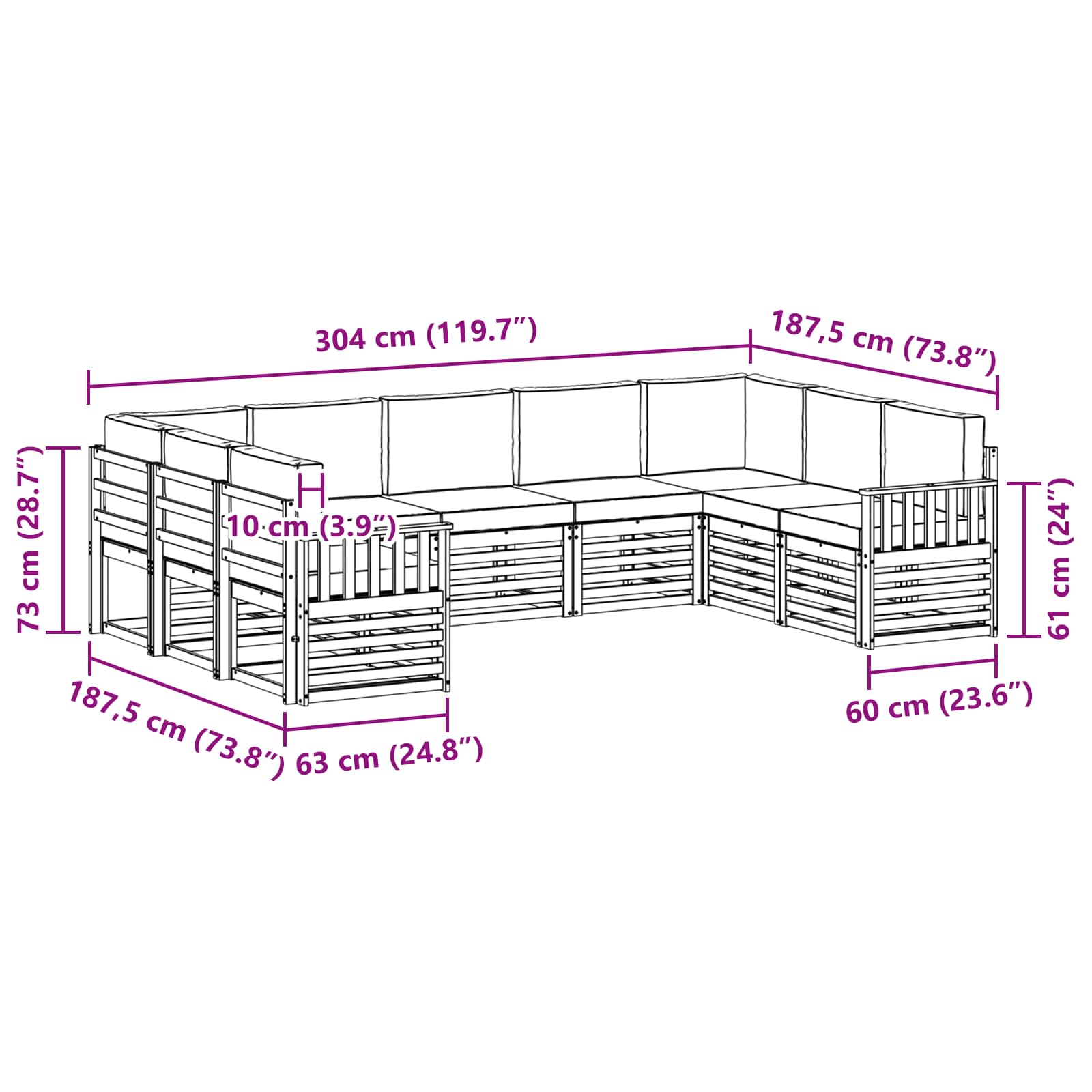 - Gesamtabmessungen: 304 x 187,5 x 73 cm (L x B x H)