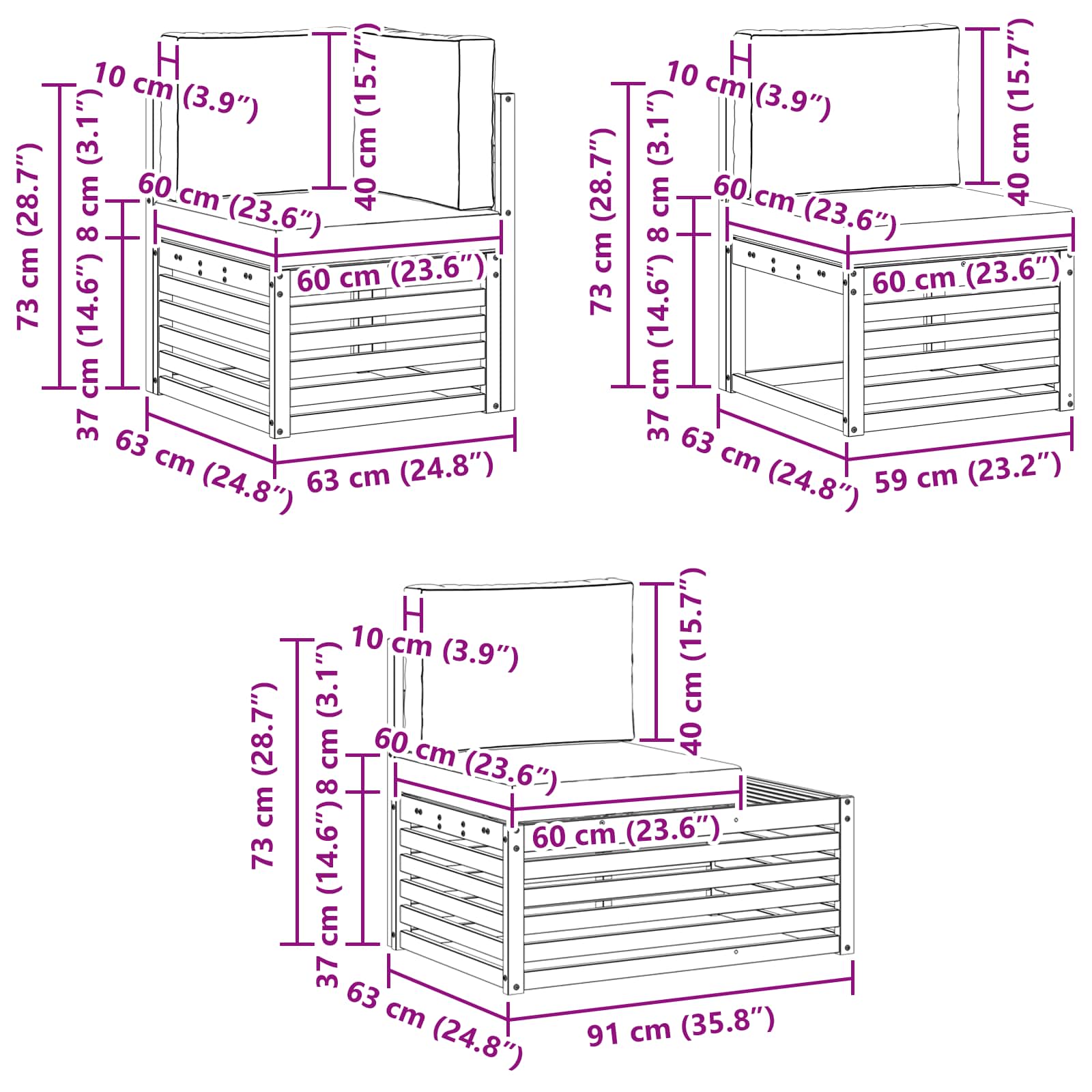 - 1 x Mittelsessel: 59 x 63 x 73 cm (LxBxH)