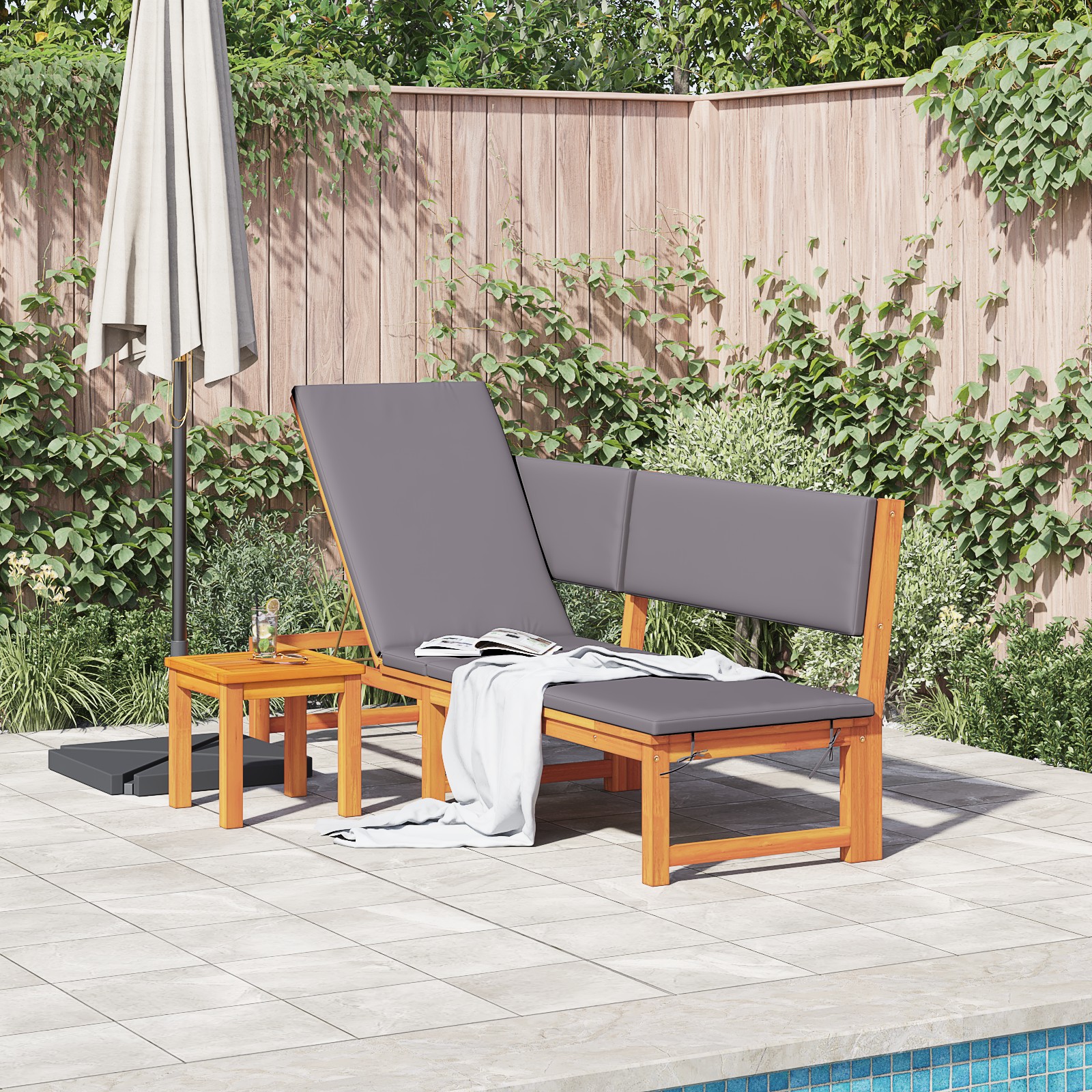 Diese verstellbare Sonnenliege ist der perfekte Begleiter für entspannende Tage im Freien. Mit ihrem modernen Look, dem stabilen Holzrahmen und den hellgrauen Kissen passt sie super in jeden Außenbereich und bietet dir Stil und Komfort. Multizone Rückenlehne: Stell die Rückenlehne auf einen von drei Winkeln bis zu 90 Grad für deinen perfekten Platz zum Lesen, Sonnenbaden oder Nickerchen ein. Luxuriöse Kissen: Die hellgrauen Kissen mit Schaumfüllung bieten hohen Komfort und machen sonnige Tage noch schöner. Faltbares Design: Diese Liege lässt sich leicht zusammenklappen für platzsparende Lagerung oder Transport. Perfekt für alle, die praktische Gartenmöbel schätzen. Stylisches Farbschema: Mit einer modernen Kombination aus Grau und natürlichem Holz bringt diese Sonnenliege einen frischen Look in deinen Außenbereich. Geräumige Abmessungen: Mit einer Sitzbreite von 60 cm und einer Tiefe von 180 cm hat sie genug Platz für eine Person, ideal zum Entspannen oder Lesen.