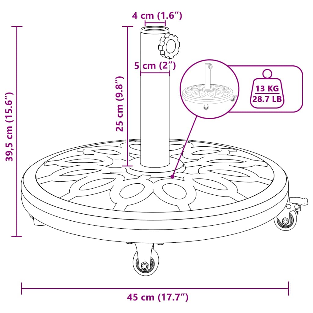Dieser moderne Sonnenschirmständer mit seinem Art Deco-Muster und den kräftigen Formen passt perfekt in jeden Garten oder auf jede Terrasse. Er bringt Eleganz und ist gleichzeitig praktisch fürs Schattenspenden. Die runde Form zieht die Blicke an und zeigt, dass modernes Design im Outdoor-Bereich möglich ist. Ideal für sonnige Nachmittage und entspannte Abende – er harmoniert wunderbar mit deiner Terrassengestaltung. Robuste Bauweise aus Polyethylen und Eisen: Hergestellt aus strapazierfähigem Polyethylen und solidem Eisen, dazu wetterbeständig – dieser Sonnenschirmständer ist stabil und langlebig. Er bleibt auch bei wechselhaftem Wetter sicher stehen und ergänzt deine Outdoor-Möbel optimal. Bequeme Räder mit Bremsen: Mit vier praktischen Rollen, von denen zwei mit Bremsen ausgestattet sind, bietet dieser Sonnenschirmständer Beweglichkeit und eine sichere Standposition. Er lässt sich leicht auf verschiedenen Oberflächen manövrieren und bleibt sicher an seinem Platz, wenn das nötig ist. Verstellbar und anpassbar: Über die breiteverstellbare Funktion lässt sich der Sonnenschirmständer an verschiedene Schirmgrößen anpassen – was einen einfachen und flexiblen Gebrauch ermöglicht, je nach deinen Bedürfnissen. Art Deco Design: Beherbergt ein stilvolles Art Deco-Muster, das die Ästhetik des Sonnenschirmständers unterstreicht und sich wunderbar in elegante Außenbereiche einfügt – perfekt für feierliche Zusammenkünfte oder ruhige Abende. Einfache Montage: Ein Schraubendreher wird für den Zusammenbau benötigt. Das Design ist einfach gehalten und sorgt für einen stressfreien Aufbau, damit du deine Schattenlösungen schnell nutzen kannst.