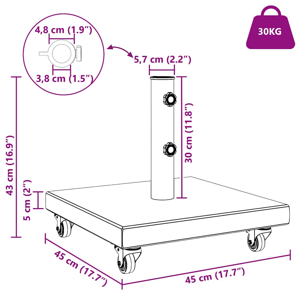 Der Sonnenschirmständer ist der perfekte Begleiter für deine Sonnenschirme draußen. Hergestellt aus stabilem Granit, kombiniert er schlichte Eleganz mit viel Funktionalität und passt in jede Outdoor-Umgebung. Durch das quadratische Design ist er eine tolle Wahl für moderne und minimalistische Gärten, während er deinen Sonnenschirm mal so richtig stabil hält, egal wie das Wetter wird. Du kannst ihn auch problemlos für große Sonnenschirme nutzen, damit dein Freiluft-Spaß ungestört bleibt. Materialien: Dieser Sonnenschirmständer ist aus hochwertigem Granit, der ihn widerstandsfähig gegen jede Witterung macht. Der Granit sieht nicht nur schick aus, sondern sorgt auch für ordentlich Gewicht und Stabilität, damit dein Sonnenschirm fest stehen bleibt, selbst bei Wind. Inklusive Komponenten: Mit verriegelbaren Rädern ausgestattet, kannst du den Sonnenschirmständer ganz einfach bewegen. Das bringt dir viel Freiheit bei der Anordnung deiner Möbel draußen und ist super praktisch. Merkmale/Funktion/Design: Dank seines robusten Designs bleibt der Ständer über viele Sommer hinweg zuverlässig. Mit seinen klaren Linien und dem schlichten Look passt er perfekt in jeden Garten oder auf jede Terrasse. Empfohlene Verwendungszwecke: Der Ständer ist speziell für Gärten und Terrassen gemacht – ideal für alle, die sich im Freien schattig aufhalten wollen. Egal ob du einen Sommerbrunch veranstaltest oder einfach nur mit einem Buch relaxen möchtest, er steht dir immer stabil zur Seite. Pflege & Wartung: Kaum Pflege nötig; einfach mit einem weichen, trockenen Tuch abwischen, um ihn sauber zu halten. Lass die aggressiven Chemikalien weg, damit der Granit schön und makellos bleibt und lange hält.