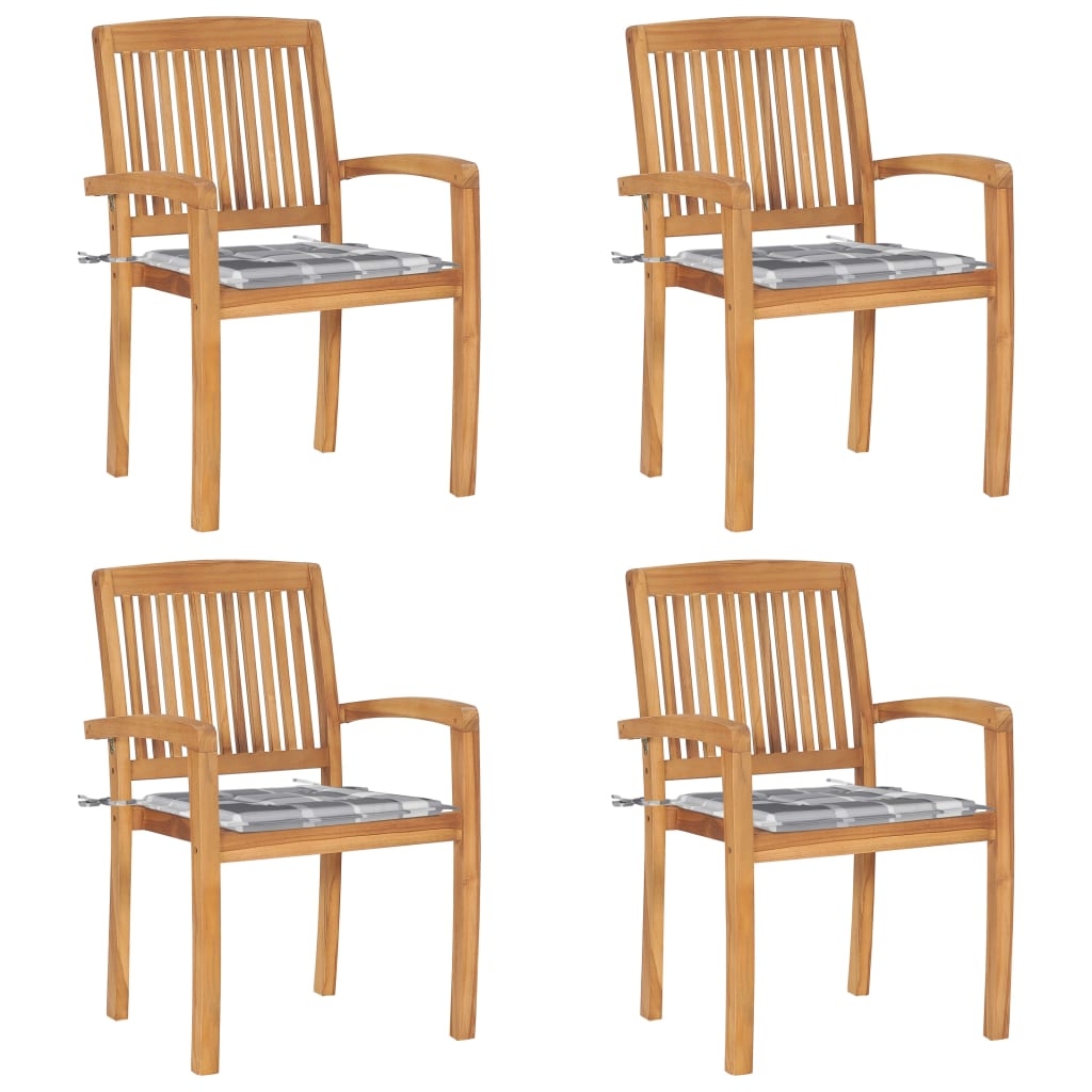 Verleihen Sie Ihrem Esszimmer, Garten oder Ihrer Terrasse einen Hauch von rustikalem Charme mit diesem stapelbaren Gartenstuhl-Set aus Holz! Das Essstuhl-Set verleiht Ihrem Innen- oder Außenbereich mit seinem eleganten Design einen Hauch von Eleganz. Dieses Teakholz-Möbel besteht aus extrem haltbarem Teakholz, das abgelagert, künstlich getrocknet und fein geschliffen worden ist, um ein sehr glattes Aussehen zu erzielen. Teak wird für seine außergewöhnliche Festigkeit und Witterungsbeständigkeit geschätzt, wodurch es sich weitaus besser als jede andere Holzart für Gartenmöbel eignet. Teak ist die perfekte Wahl, wenn Sie ein langlebiges Gartenmöbel kaufen möchten. Es ist leicht zu pflegen und mit einem feuchten Tuch zu reinigen. Außerdem kann der Esszimmerstuhl gestapelt werden, um bei Nichtgebrauch Stauraum zu sparen. Darüber hinaus sorgen die mitgelieferten Kissen für zusätzlichen Komfort. Jedes Kissen hat 2 Sätze Bänder, um es fest am Stuhl zu befestigen. Hinweis: Um die Lebensdauer Ihrer Gartenmöbel zu verlängern, empfehlen wir Ihnen, diese regelmäßig zu reinigen und bei Nichtgebrauch im Freien abzudecken.Reinigung: Verwenden Sie eine milde SeifenlösungLagerung: Wenn möglich, an einem kühlen, trockenen Ort im Innenbereich lagern. Wenn das Produkt im Freien gelagert wird, schützen Sie es mit einer wasserdichten Abdeckung. Wischen und trocknen Sie das überschüssige Wasser oder den Schnee nach Regen oder Schneefall von der ebenen Fläche. Sorgen Sie für eine ausreichende Luftzirkulation, um feuchtigkeitsbedingte Schäden zu vermeiden.