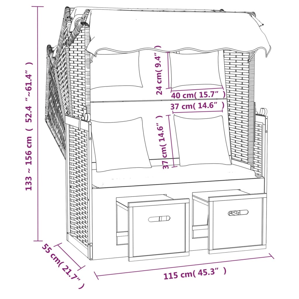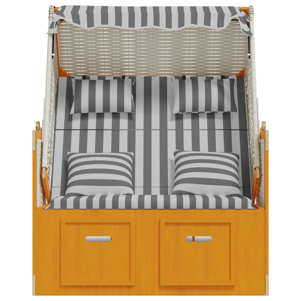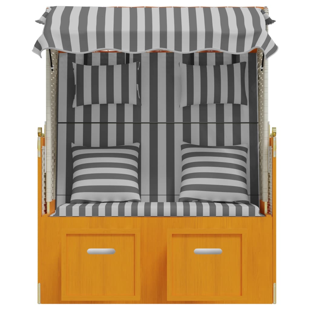 Dieser komfortable Strandkorb bietet einen großen und angenehmen Platz zum Entspannen am Strand, am Fluss oder im Garten. Erstklassiges Material: Mit einem Holzrahmen und einer Klappe aus Poly Ratten versehen, ist die Terrassenliege robust, strapazierfähig und lässt sich mit einem feuchten Tuch einfach reinigen.Praktische Funktionen: Die Strandliege ist mit einem Dach zum Schutz vor der Sonne versehen und lässt sich dank Seitenwände selbst an windigen Tagen verwenden.Ausziehbares Design: Dank der ausziehbaren Hocker sorgt die Sonnenliege für höchsten Komfort.Verstellbare Rückenlehne: Die Rückenlehne des Strandstuhls lässt sich in 3 Positionen verstellen, sodass Sie stets die bequemste Position zum Entspannen finden werden.Komfortables Sitzgefühl: Die mitgelieferten, gut gepolsterten Kopf- und Rückenkissen sorgen für höchsten Sitzkomfort. Hinweis:Um die Lebensdauer deiner Gartenmöbel zu verlängern, empfehlen wir dir, sie mit einer wasserdichten Hülle zu schützen.