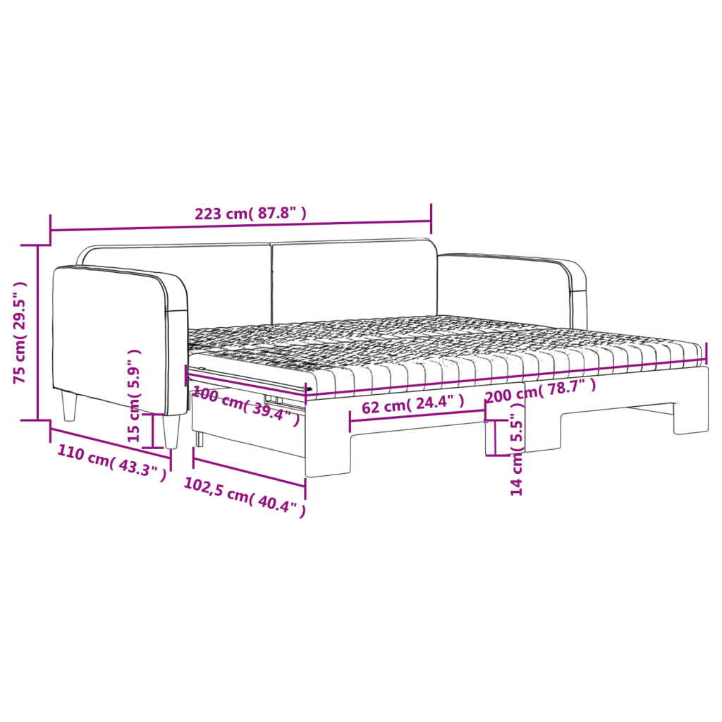 Dieses ausziehbare 2-in-1-Tagesbett, das sowohl als Sofa als auch als Bett dient, ist eine praktische und auffällige Ergänzung zu deinem Wohn- oder Schlafzimmer. Vielseitiges Tagesbett: Das Schlafsofa fungiert tagsüber als Sofa und lässt sich nachts durch Ausziehen des Rollkastens leicht in ein Doppelbett verwandeln - eine praktische Lösung, um Gästen einen bequemen Schlafplatz zu bieten und den Platz zu maximieren.Komfortable Schaumstoffmatratze: Dieses Schlafbett wird samt zwei Schaumstoffmatratzen geliefert, die für maximalen Halt und optimalen Komfort sorgen.Strapazierfähiger Stoff und robuste Konstruktion: Dieses Tagesbettsofa besitzt einen stabilen Rahmen aus Holz und Metall und ist mit strapazierfähigem und bequemem Stoff bezogen.