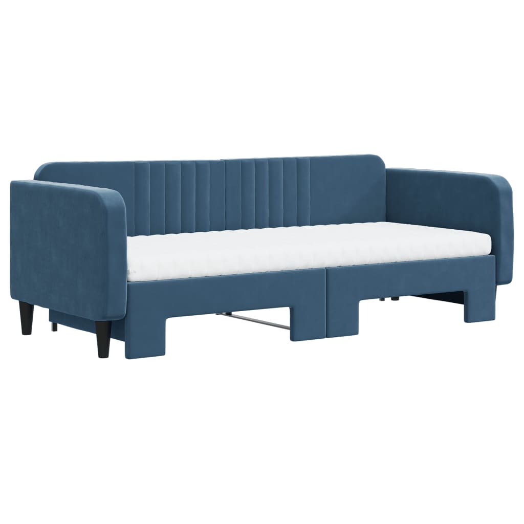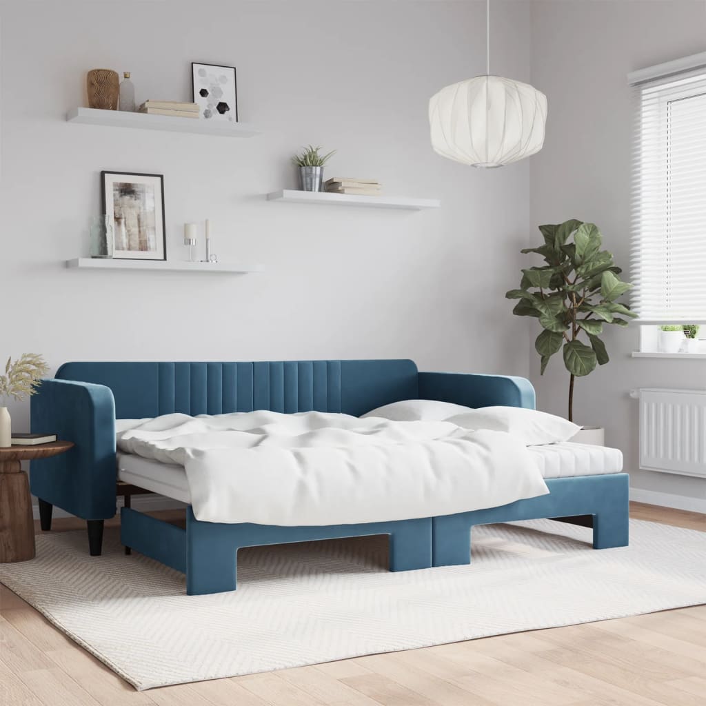 Dieses ausziehbare 2-in-1-Tagesbett, das sowohl als Sofa als auch als Bett dient, ist eine praktische und auffällige Ergänzung zu deinem Wohn- oder Schlafzimmer. Vielseitiges Tagesbett: Das Schlafsofa fungiert tagsüber als Sofa und lässt sich nachts durch Ausziehen des Rollkastens leicht in ein Doppelbett verwandeln - eine praktische Lösung, um Gästen einen bequemen Schlafplatz zu bieten und den Platz zu maximieren.Komfortable Schaumstoffmatratze: Dieses Schlafbett wird samt zwei Schaumstoffmatratzen geliefert, die für maximalen Halt und optimalen Komfort sorgen.Weicher Samt und robuste Konstruktion: Dieses Schlafsofa besitzt einen stabilen Rahmen aus Holz und Metall und ist mit weichem und bequemem Samt bezogen.Modernes Design: Das Couchbett weist ein modernes Design auf, das sich durch klare Linien, einen minimalistischen Look sowie Natürlichkeit auszeichnet und deiner Einrichtung eine moderne Note verleiht!
