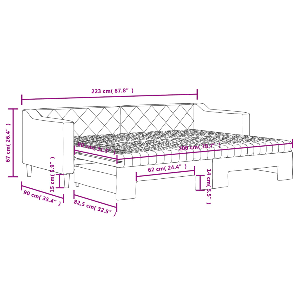 Dieses ausziehbare 2-in-1-Tagesbett, das sowohl als Sofa als auch als Bett dient, ist eine praktische und auffällige Ergänzung zu deinem Wohn- oder Schlafzimmer. Vielseitiges Tagesbett: Das Schlafsofa fungiert tagsüber als Sofa und lässt sich nachts durch Ausziehen des Rollkastens leicht in ein Doppelbett verwandeln - eine praktische Lösung, um Gästen einen bequemen Schlafplatz zu bieten und den Platz zu maximieren.Komfortable Schaumstoffmatratze: Dieses Schlafbett wird samt zwei Schaumstoffmatratzen geliefert, die für maximalen Halt und optimalen Komfort sorgen.Strapazierfähiger Stoff und robuste Konstruktion: Dieses Tagesbettsofa besitzt einen stabilen Rahmen aus Holz und Metall und ist mit strapazierfähigem und bequemem Stoff bezogen.Modernes Design: Das Sofabett weist ein modernes Design auf, das sich durch klare Linien und einen minimalistischen Look auszeichnet und deiner Einrichtung eine moderne Note verleihen wird!