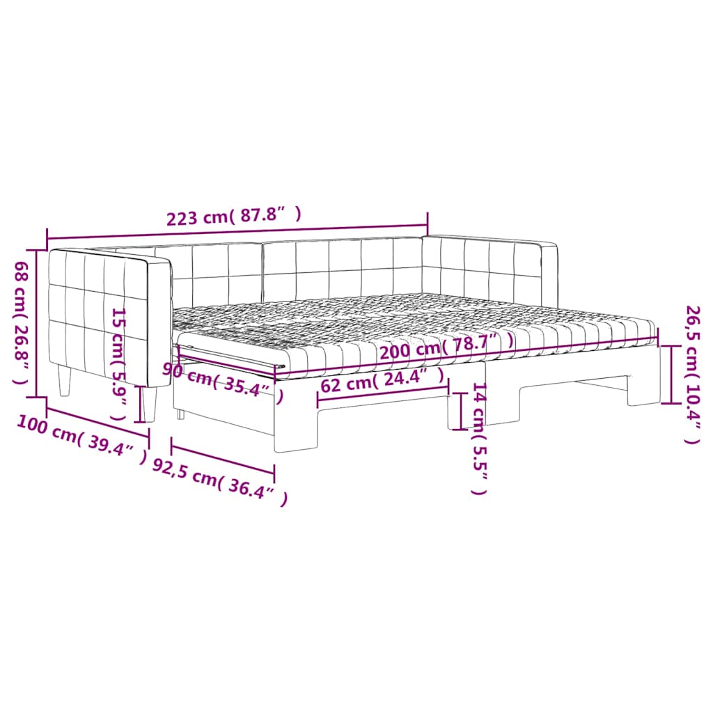 Dieses ausziehbare 2-in-1-Tagesbett, das sowohl als Sofa als auch als Bett dient, ist eine praktische und auffällige Ergänzung zu deinem Wohn- oder Schlafzimmer. Vielseitiges Tagesbett: Das Schlafsofa fungiert tagsüber als Sofa und lässt sich nachts durch Ausziehen des Rollkastens leicht in ein Doppelbett verwandeln - eine praktische Lösung, um Gästen einen bequemen Schlafplatz zu bieten und den Platz zu maximieren.Komfortable Schaumstoffmatratze: Dieses Schlafbett wird samt zwei Schaumstoffmatratzen geliefert, die für maximalen Halt und optimalen Komfort sorgen.Weicher Samt und robuste Konstruktion: Dieses Schlafsofa besitzt einen stabilen Rahmen aus Holz und Metall und ist mit weichem und bequemem Samt bezogen.Modernes Design: Das Couchbett weist ein modernes Design auf, das sich durch klare Linien, einen minimalistischen Look sowie Natürlichkeit auszeichnet und deiner Einrichtung eine moderne Note verleiht!