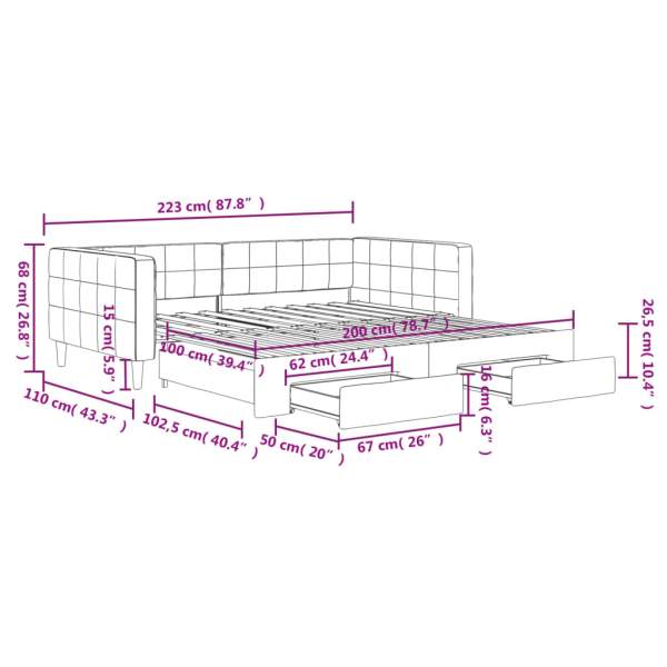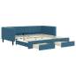Dieses ausziehbare 2-in-1-Tagesbett, das sowohl als Sofa als auch als Bett dient, ist eine praktische und auffällige Ergänzung zu deinem Wohn- oder Schlafzimmer. Vielseitiges Tagesbett: Das Schlafsofa fungiert tagsüber als Sofa und lässt sich nachts durch Ausziehen des Rollkastens leicht in ein Doppelbett verwandeln - eine praktische Lösung, um Gästen einen bequemen Schlafplatz zu bieten und den Platz zu maximieren.Reichlich Stauraum: Dieses Gästebett verfügt über zwei Schubladen mit Rollen, die reichlich Stauraum für Kleidung, Socken, Spielzeug, Kissen usw. bieten.Weicher Samt und robuste Konstruktion: Dieses Schlafsofa besitzt einen stabilen Rahmen aus Holz und Metall und ist mit weichem und bequemem Samt bezogen.Modernes Design: Das Couchbett weist ein modernes Design auf, das sich durch klare Linien, einen minimalistischen Look sowie Natürlichkeit auszeichnet und deiner Einrichtung eine moderne Note verleiht! Gut zu wissen:Matratzen sind bei diesem Bett nicht im Lieferumfang enthalten. Wir bieten jedoch eine große Auswahl an Matratzen an. Du kannst in unserem Shop nach passenden Matratzen suchen.