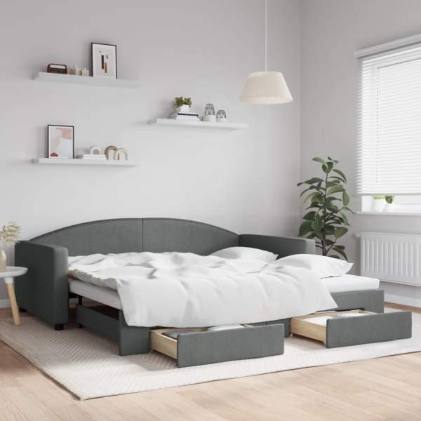 Dieses ausziehbare 2-in-1-Tagesbett, das sowohl als Sofa als auch als Bett dient, ist eine praktische und auffällige Ergänzung zu deinem Wohn- oder Schlafzimmer. Vielseitiges Tagesbett: Das Schlafsofa fungiert tagsüber als Sofa und lässt sich nachts durch Ausziehen des Rollkastens leicht in ein Doppelbett verwandeln - eine praktische Lösung, um Gästen einen bequemen Schlafplatz zu bieten und den Platz zu maximieren.Reichlich Stauraum: Dieses Gästebett verfügt über zwei Schubladen mit Rollen, die reichlich Stauraum für Kleidung, Socken, Spielzeug, Kissen usw. bieten.Strapazierfähiger Stoff und robuste Konstruktion: Dieses Tagesbettsofa besitzt einen stabilen Rahmen aus Holz und Metall und ist mit strapazierfähigem und bequemem Stoff bezogen. Gut zu wissen:Matratzen sind bei diesem Bett nicht im Lieferumfang enthalten. Wir bieten jedoch eine große Auswahl an Matratzen an. Du kannst in unserem Shop nach passenden Matratzen suchen.