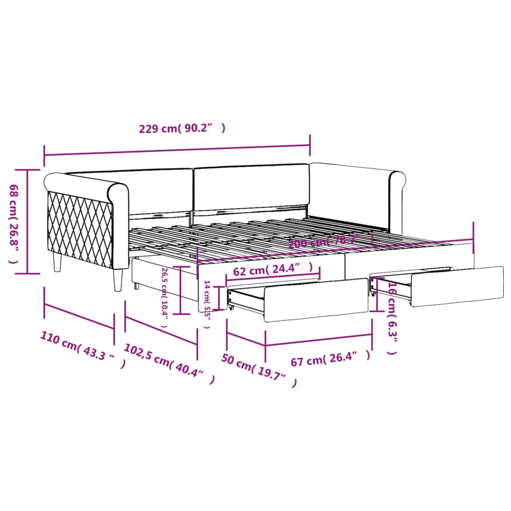 Dieses ausziehbare 2-in-1-Tagesbett, das sowohl als Sofa als auch als Bett dient, ist eine praktische und auffällige Ergänzung zu deinem Wohn- oder Schlafzimmer. Vielseitiges Tagesbett: Das Schlafsofa fungiert tagsüber als Sofa und lässt sich nachts durch Ausziehen des Rollkastens leicht in ein Doppelbett verwandeln - eine praktische Lösung, um Gästen einen bequemen Schlafplatz zu bieten und den Platz zu maximieren.Reichlich Stauraum: Dieses Gästebett verfügt über zwei Schubladen mit Rollen, die reichlich Stauraum für Kleidung, Socken, Spielzeug, Kissen usw. bieten.Weicher Samt und robuste Konstruktion: Dieses Schlafsofa besitzt einen stabilen Rahmen aus Holz und Metall und ist mit weichem und bequemem Samt bezogen.Modernes Design: Das Couchbett weist ein modernes Design auf, das sich durch klare Linien, einen minimalistischen Look sowie Natürlichkeit auszeichnet und deiner Einrichtung eine moderne Note verleiht! Gut zu wissen:Matratzen sind bei diesem Bett nicht im Lieferumfang enthalten. Wir bieten jedoch eine große Auswahl an Matratzen an. Du kannst in unserem Shop nach passenden Matratzen suchen.