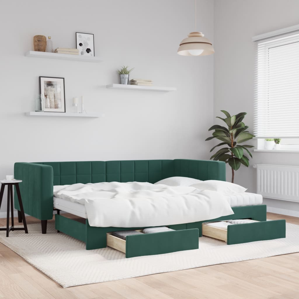 Dieses ausziehbare 2-in-1-Tagesbett, das sowohl als Sofa als auch als Bett dient, ist eine praktische und auffällige Ergänzung zu deinem Wohn- oder Schlafzimmer. Vielseitiges Tagesbett: Das Schlafsofa fungiert tagsüber als Sofa und lässt sich nachts durch Ausziehen des Rollkastens leicht in ein Doppelbett verwandeln - eine praktische Lösung, um Gästen einen bequemen Schlafplatz zu bieten und den Platz zu maximieren.Reichlich Stauraum: Dieses Gästebett verfügt über zwei Schubladen mit Rollen, die reichlich Stauraum für Kleidung, Socken, Spielzeug, Kissen usw. bieten.Komfortable Schaumstoffmatratze: Dieses Schlafbett wird samt zwei Schaumstoffmatratzen geliefert, die für maximalen Halt und optimalen Komfort sorgen.Weicher Samt und robuste Konstruktion: Dieses Schlafsofa besitzt einen stabilen Rahmen aus Holz und Metall und ist mit weichem und bequemem Samt bezogen.