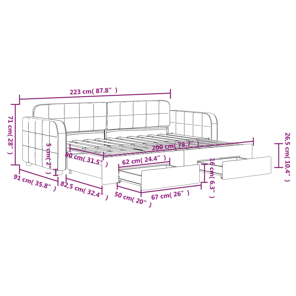 - Abmessungen (nicht ausgezogen): 223 x 91 x 71 cm (L x B x H)