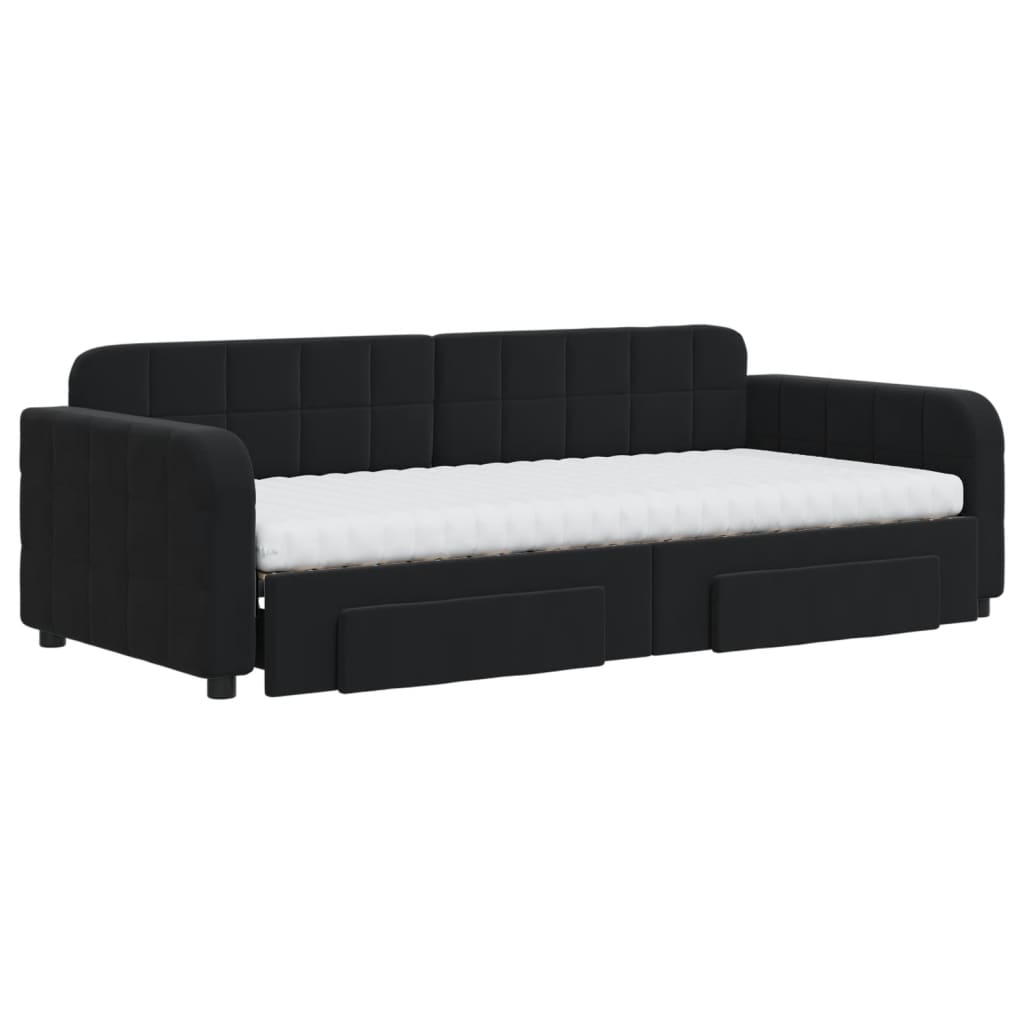 Dieses ausziehbare 2-in-1-Tagesbett, das sowohl als Sofa als auch als Bett dient, ist eine praktische und auffällige Ergänzung zu deinem Wohn- oder Schlafzimmer. Vielseitiges Tagesbett: Das Schlafsofa fungiert tagsüber als Sofa und lässt sich nachts durch Ausziehen des Rollkastens leicht in ein Doppelbett verwandeln - eine praktische Lösung, um Gästen einen bequemen Schlafplatz zu bieten und den Platz zu maximieren.Reichlich Stauraum: Dieses Gästebett verfügt über zwei Schubladen mit Rollen, die reichlich Stauraum für Kleidung, Socken, Spielzeug, Kissen usw. bieten.Komfortable Schaumstoffmatratze: Dieses Schlafbett wird samt zwei Schaumstoffmatratzen geliefert, die für maximalen Halt und optimalen Komfort sorgen.Weicher Samt und robuste Konstruktion: Dieses Schlafsofa besitzt einen stabilen Rahmen aus Holz und Metall und ist mit weichem und bequemem Samt bezogen.