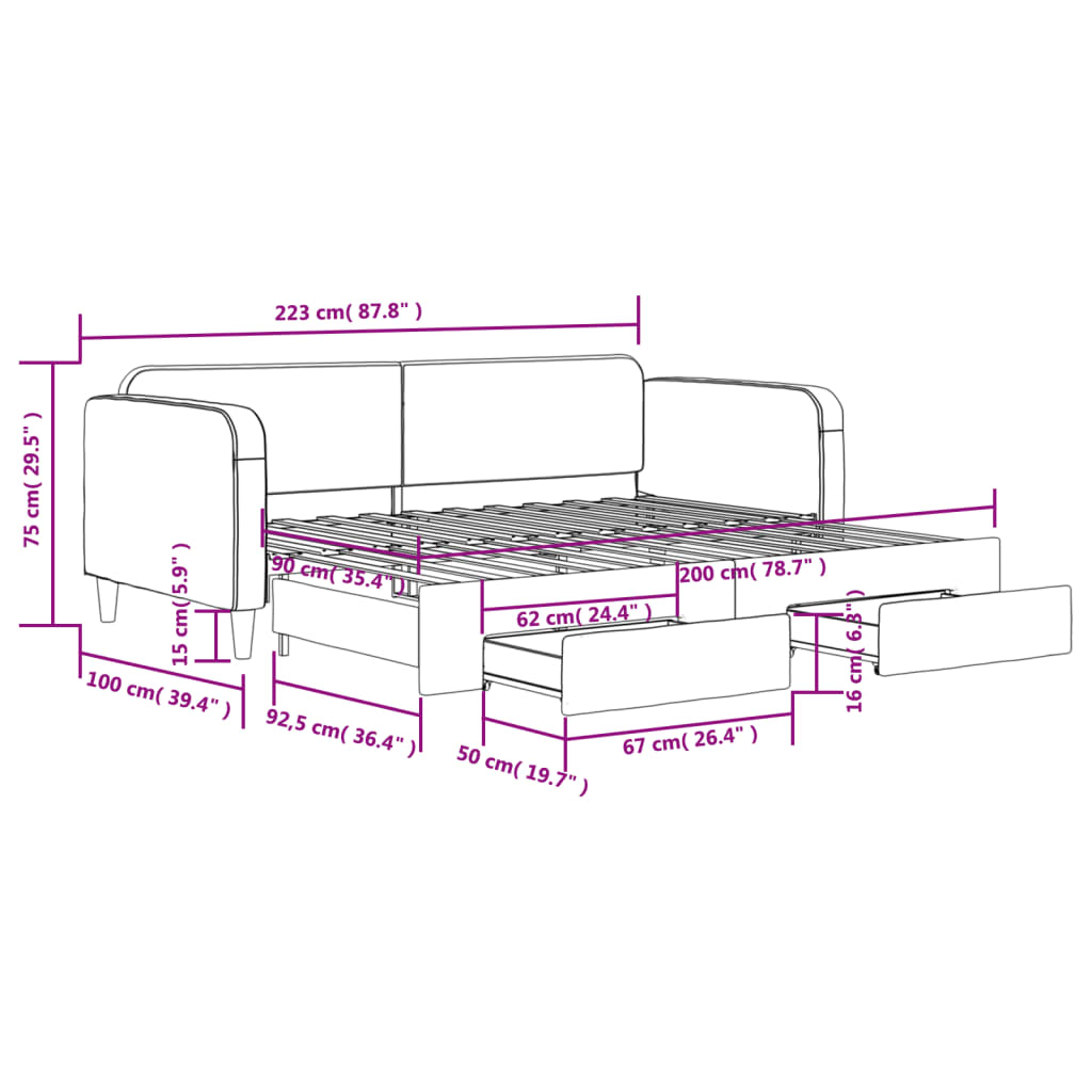Dieses ausziehbare 2-in-1-Tagesbett, das sowohl als Sofa als auch als Bett dient, ist eine praktische und auffällige Ergänzung zu deinem Wohn- oder Schlafzimmer. Vielseitiges Tagesbett: Das Schlafsofa fungiert tagsüber als Sofa und lässt sich nachts durch Ausziehen des Rollkastens leicht in ein Doppelbett verwandeln - eine praktische Lösung, um Gästen einen bequemen Schlafplatz zu bieten und den Platz zu maximieren.Reichlich Stauraum: Dieses Gästebett verfügt über zwei Schubladen mit Rollen, die reichlich Stauraum für Kleidung, Socken, Spielzeug, Kissen usw. bieten.Strapazierfähiger Stoff und robuste Konstruktion: Dieses Tagesbettsofa besitzt einen stabilen Rahmen aus Holz und Metall und ist mit strapazierfähigem und bequemem Stoff bezogen. Gut zu wissen:Die Matratzen sind nicht im Lieferumfang dieses Bettes enthalten. Wir bieten jedoch eine große Auswahl an Matratzen an. Du kannst in unserem Shop nach passenden Matratzen suchen.