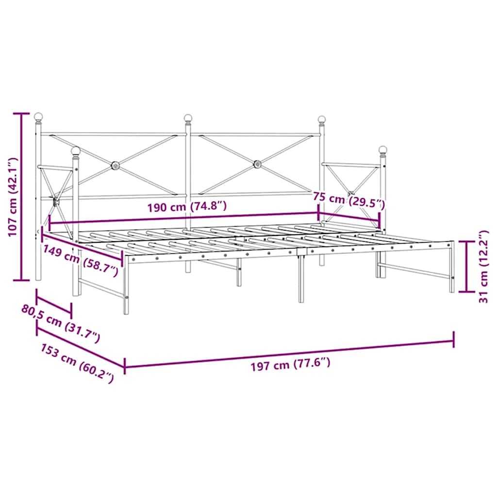 - Bett-Maße (nicht ausgezogen): 197 x 80,5 x 107 cm (L x B x H)