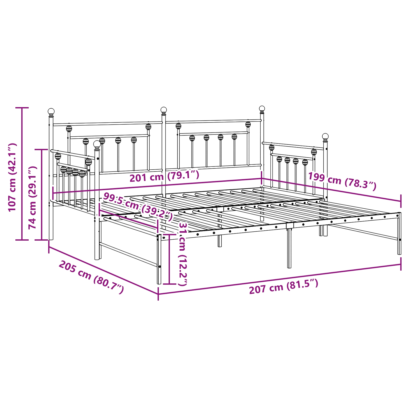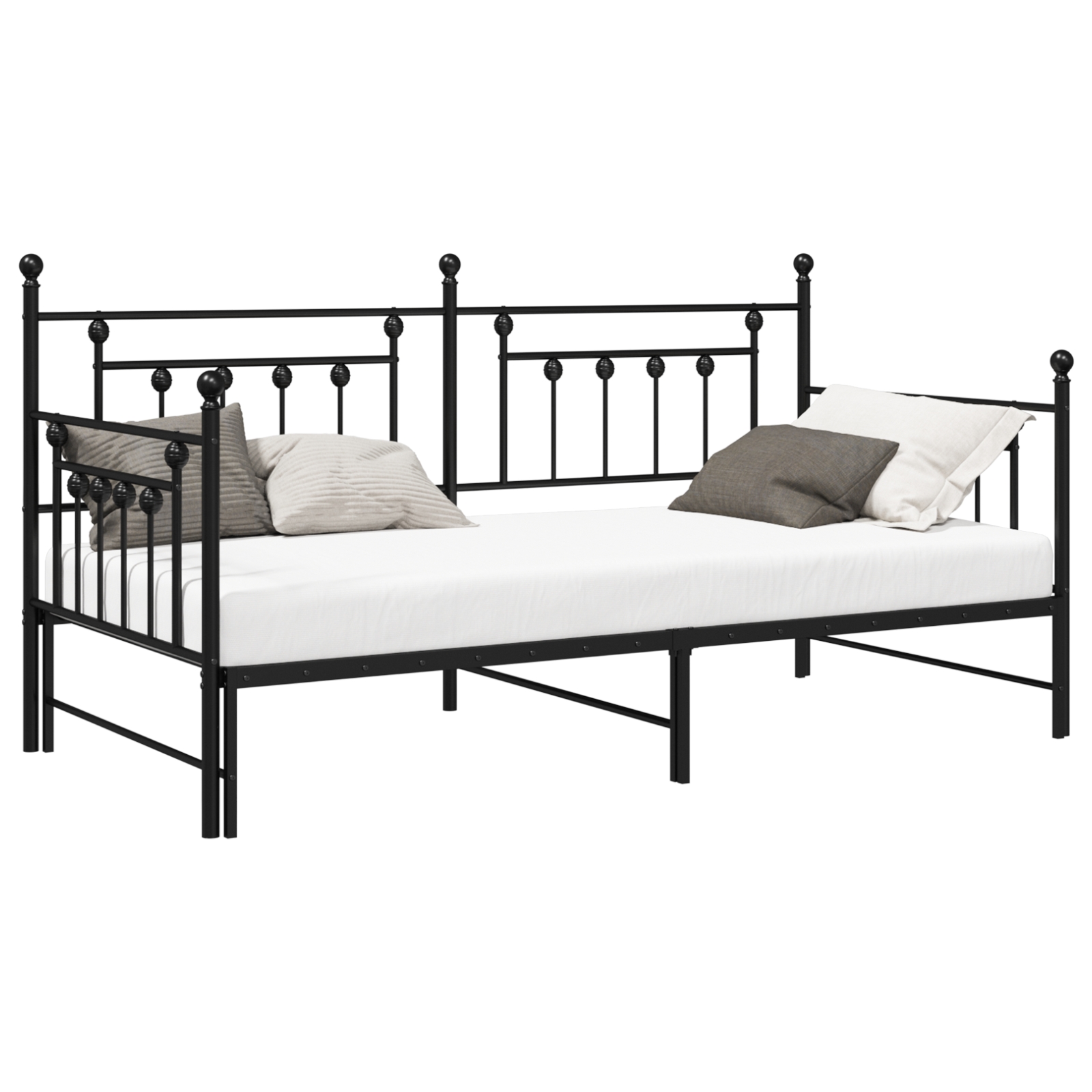 Dieses schwarze Metallbettgestell mit Trundle ist ein stylisches und vielseitiges Möbelstück, das Funktionalität mit modernem Design kombiniert und gut für jedes Schlafzimmer geeignet ist. Das schicke matte Finish und die strukturierte Bauweise verleihen ihm einen eleganten Look, was es zur idealen Wahl für Erwachsenen- oder Gästezimmer macht, während es gleichzeitig Platz spart. Verwandlungsdesign: Das Bettgestell verwandelt sich kinderleicht in eine bequeme Sitzgelegenheit, wenn du es brauchst. Der Wechsel vom Bett zu einer Sofalike Anordnung steigert die Flexibilität und Funktionalität in jedem Bereich. Geräumige Maße: Mit einer Größe von 100 x 200 cm passt dieses Bettgestell bequem für zwei Personen und sorgt für erholsame Nächte und entspannte Zusammenkünfte. Stabile Bauweise: Aus hochwertigem Metall hergestellt, bietet das Bettgestell tollen Halt und Stabilität und trägt bis zu 200 kg. Die robuste Bauweise sorgt für eine langfristige Nutzung und ist eine clevere Investition für dein Zuhause. Stilvolles modernes Aussehen: Das beeindruckende schwarze, pulverbeschichtete Finish verleiht dem Bettgestell ein glattes, schickes Aussehen, das wunderbar mit zeitgenössischem Dekor harmoniert. Sein stylischer Look hebt die Atmosphäre jedes Schlafzimmers oder Gästezimmers. Einfach zu pflegen: Für den täglichen Gebrauch konzipiert, kannst du das Bettgestell problemlos mit einem weichen Tuch abwischen, um es sauber und aufgeräumt zu halten. Regelmäßige Pflege sorgt dafür, dass dein Raum einladend bleibt.