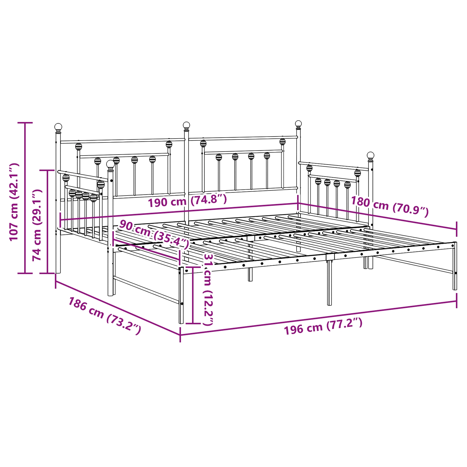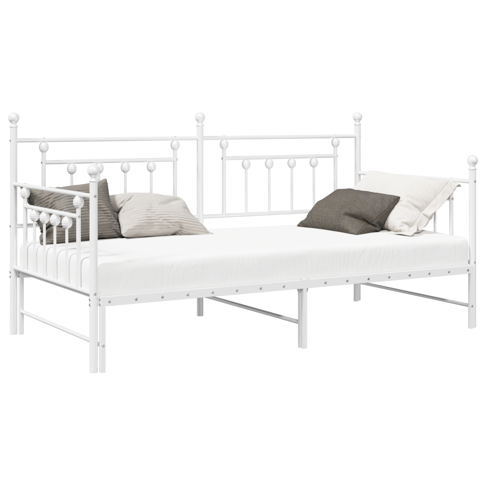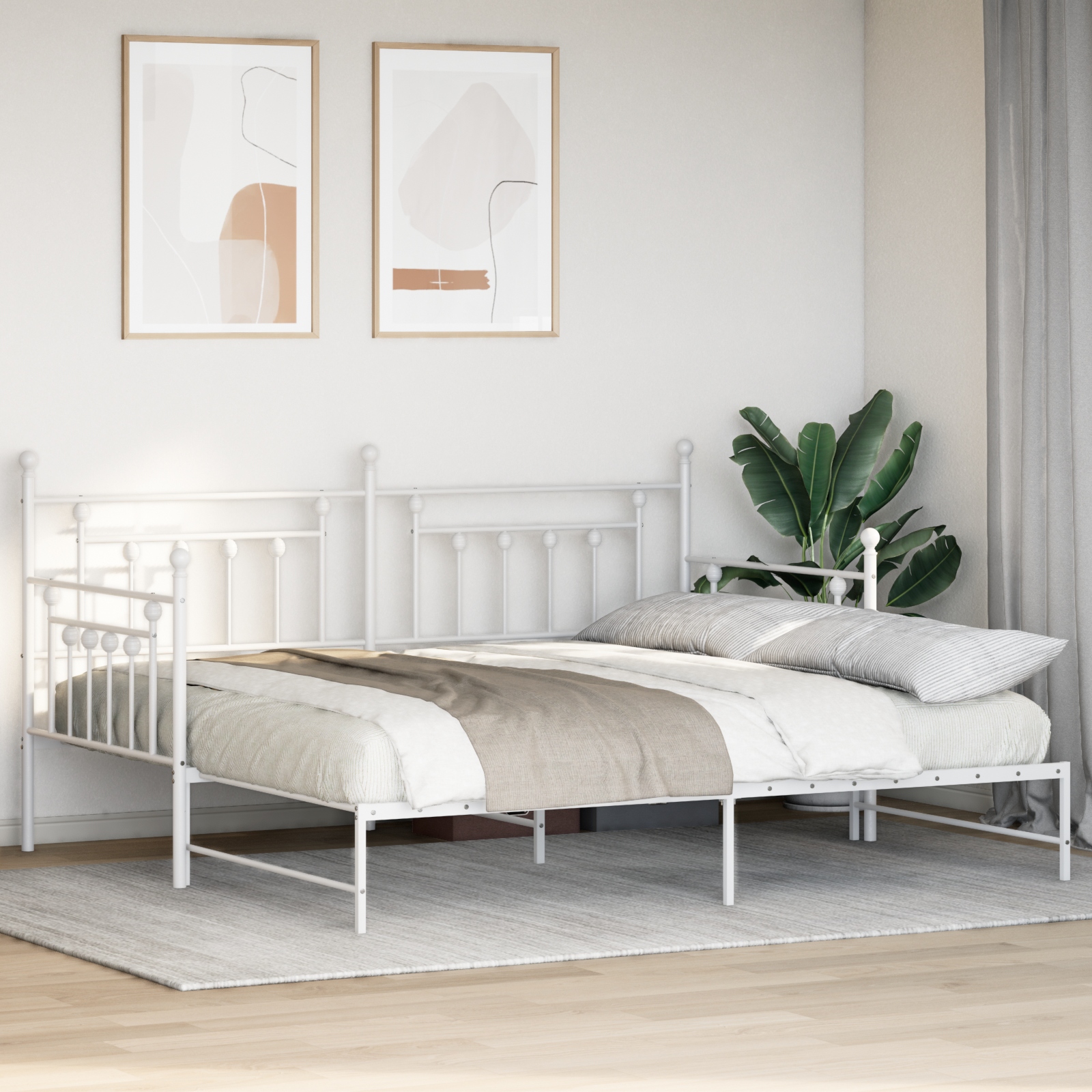 Dieses umwandelbare Bettgestell mit Ausziehbett vereint Stil und Usability in einem kompakten Format, perfekt für jedes moderne Schlafzimmer. Sein schickes Design hat glatte Linien und ein ansprechendes weißes Finish, das deinem Raum Frische verleiht und gleichzeitig alle nötigen Funktionen bietet. Es verwandelt sich mühelos von einem Bett zu einem bequemen Sofa – ideal für kleinere Räume, wo du sowohl einen Schlafplatz für die Nacht als auch tagsüber einen Platz zum Sitzen brauchst. Platzsparendes Design: Der integrierte Ausziehmechanismus maximiert den Raum, indem er zusätzliche Schlafmöglichkeiten bietet, ohne klobig zu wirken. Perfekt, um Gäste zu empfangen – damit kannst du Freunde und Familie bequem unterbringen. Haltbares Material: Hergestellt aus hochwertigem Metall, ist dieses Bettgestell langlebig und kann bis zu 150 kg tragen, sodass es sicher für den täglichen Gebrauch ist. Moderne Ästhetik: Mit einer eleganten, glatten weißen Oberfläche bringt es einen Hauch von Klasse in dein Schlafzimmer und fügt sich gut in verschiedene Stile ein – egal ob modern, minimalistisch oder traditionell. Vielseitige Nutzung: Mehr als nur ein Bett, verwandelt sich dieser Rahmen tagsüber in ein Sofa, was dir einen gemütlichen Platz zum Entspannen oder für Gäste bietet und die Raumnutzung maximiert. Einfache Pflege: Die Reinigung ist ein Kinderspiel, einfach mit einem feuchten Tuch abwischen, um den Rahmen frisch und ordentlich zu halten und deinen Raum einladend wirken zu lassen.