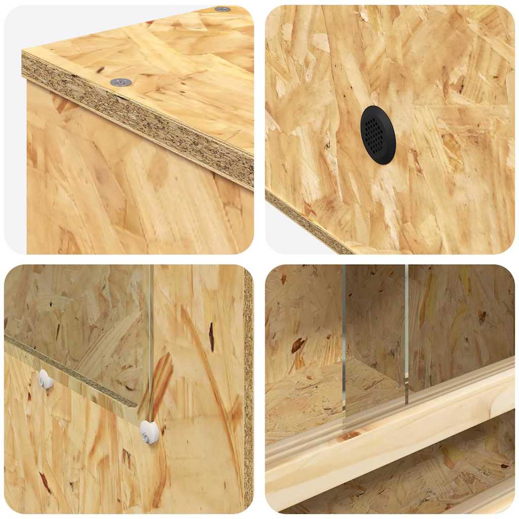 Dieses OSB-Terrarium ist für Reptilien-Liebhaber gemacht, die sowohl auf Aussehen als auch auf Nutzen Wert legen. Mit seinem rustikalen Charme zeigt es eine natürliche, coole Schönheit, die sich super in jede Wohnung einfügt. Es bietet genügend Platz für deine Haustiere und ist somit ein vielseitiger Lebensraum für Reptilien oder Nagetiere. Die quadratische Form und die matte Oberfläche sorgen für schlichte Eleganz und machen deine Tiere zur echten Augenweide. Langlebige Materialien: Hergestellt aus robustem OSB, hat das Terrarium einen starken und stylishen Look. Die stabilen OSB-Paneele überstehen energiegeladene Haustiere oder häufige Umsetzungen ohne Probleme. Ergänzt mit teilschlagfestem Glas hast du ein schickes und sicheres Gehege. Umfassendes Design: Mit einem rustikalen Look sind die OSB-Rahmen und Einbauregale perfekt, um den Lebensraum deiner Haustiere mit Pflanzen, Verstecken und Deko zu gestalten. Die gleichmäßig gleitenden Glasschiebetüren machen das alles einfach zugänglich und sorgen für eine saubere Umgebung für deine Tiere. Funktionale Nutzung: Entworfen für verschiedene Reptilienarten, bietet das offene System genug Platz für Wärmequellen. Die Schiebetüren schaffen den perfekten Mix aus Sichtbarkeit und Versteckmöglichkeiten, so können sich deine Reptilien ganz wohlfühlen. Dieses Design erlaubt kreative Habitatgestaltungen für unterschiedliche Haustiere. Vielseitige Nutzungsmöglichkeiten: Obwohl hauptsächlich für Reptilien gedacht, eignet sich dieses Terrarium auch für Nagetiere. Ideal für Tierliebhaber, die verschiedene Lebensräume in einem Raum haben möchten, es bietet Flexibilität und sieht dabei auch noch gut aus. Wartung & Pflege: Sauber machen ist mit einem feuchten Tuch ein Kinderspiel. Die matte Oberfläche bleibt stylisch und braucht nicht viel Pflege. Perfekt für alle Tierbesitzer, verspricht das Terrarium einfache Pflege und lange Lebensdauer mit minimalem Aufwand.