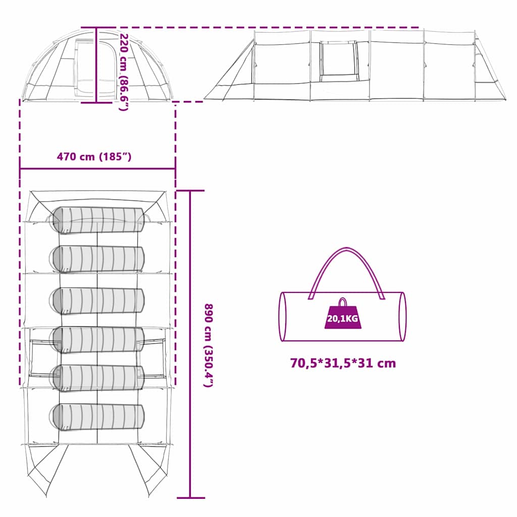 Dieses moderne Tunnelzelt ist ein echter Hingucker für jedes Outdoor-Abenteuer und bietet Komfort und Funktionalität während der Sommersaison. Mit klaren Linien und einem geräumigen Innenraum bringt es ergonomische Merkmale mit, die sich ideal für mehrtägige Erkundungen eignen. Hergestellt aus 185T Polyester mit PU-Beschichtung, garantiert es zuverlässigen Schutz vor den Elementen. Egal ob im Garten, auf der Terrasse oder am Campingplatz – dieses Tunnelzelt lädt ein, ein tolles Erlebnis im Freien zu haben. Materialien: Das Zelt besteht aus 185T Polyester mit PU-Beschichtung und bietet damit eine tolle wasserdichte und UV-beständige Leistung – für zuverlässigen Schutz beim Sommer-Camping. Der robuste Stahlrahmen hält den Taffeta-Stoff und sorgt für Langlebigkeit und einfache Pflege. Enthaltene Komponenten: Im Lieferumfang sind ein Vordach, ein Satz Stangen, eine Tragetasche, 8 Spannleinen und 24 Erdspieße enthalten. Jedes Teil trägt dazu bei, das Zelt stabil und einfach in der Handhabung zu gestalten, und macht den Aufbau an jedem Campingplatz schnell und unkompliziert. Eigenschaften/Funktion/Design: Praktische Features wie Belüftungsfenster und eine Innentasche sorgen für einen organisierten Raum und gute Luftzirkulation. Der bequeme e-Port und der integrierte Licht-Haken erhöhen die Funktionalität und bringen moderne Praktikabilität in dein Outdoor-Erlebnis. Empfohlene Verwendungen: Ideal für Garten- und Terrassenumgebungen in der Camping-Saison, ist dieses Zelt perfekt für Übernachtungsabenteuer und bietet viel Schutz und Komfort. Mit seinem flexiblen Design passt es zu verschiedenen Outdoor-Aktivitäten, von Familienausflügen bis zu Solo-Abenteuern. Pflege & Wartung: Um die Langlebigkeit und Leistung zu erhalten, wische das Zelt nach der Benutzung mit einem feuchten Tuch ab – scharfe Chemikalien braucht man nicht. Der Aufbau erfordert anfangs zwei Personen mit Ankern, was für zuverlässigen Schutz unter verschiedenen Bedingungen im Freien sorgt.