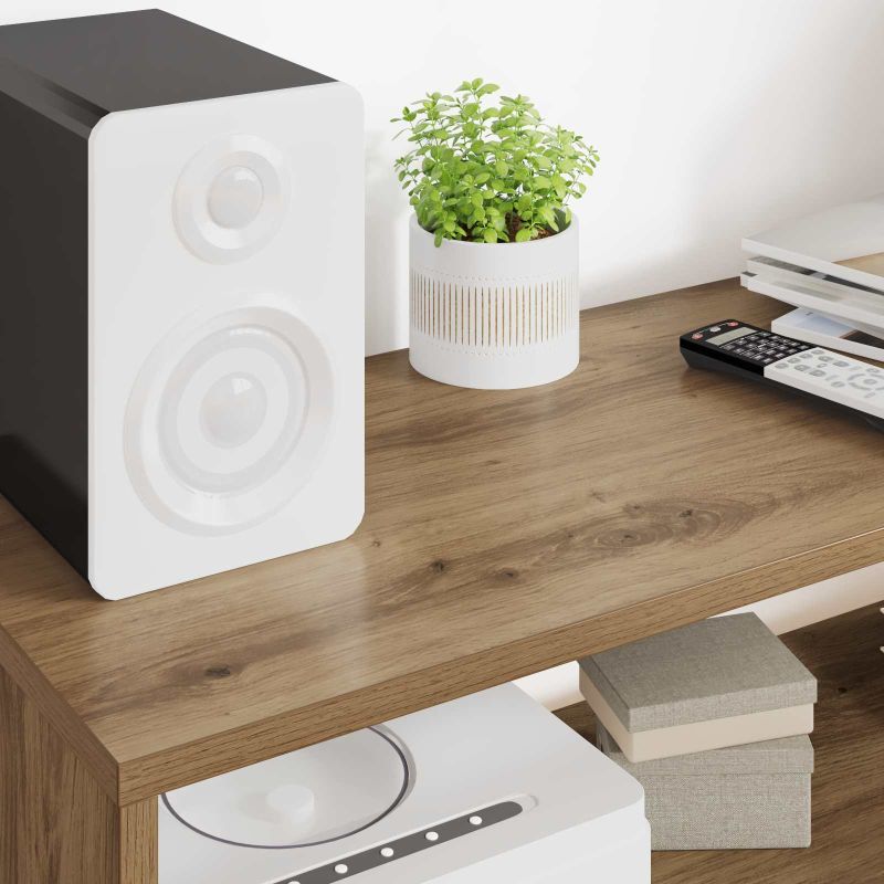 Dieser TV-Schrank kombiniert Style und Funktion. Mit seiner schlanken Form passt er super in jedes moderne Wohnzimmer und hat viel Platz für Medien und Co. Er ist nicht nur praktisch, sondern auch ein echter Hingucker in deinem Unterhaltungsbereich, der sich problemlos in deine gesamte Wohnraumgestaltung einfügt. Materialien: Der Schrank ist aus Holzwerkstoff gebaut und hat einen stabilen Rahmen. Die hochwertige Holztextur bringt Eleganz und macht ihn robust genug für den täglichen Einsatz, ideal für Haushalte mit vielen Gästen oder aktiven Kids und Tieren. Eingeschlossene Komponenten: Mit praktischen Regalbrettern bietet er eine einfache Möglichkeit, verschiedene Geräte und Dekos zu ordnen. Jedes Regal ist stabil und hält auch schwere Geräte wie Fernseher oder Musikanlagen aus, was ihn perfekt für Technik-Liebhaber macht. Funktionen / Design: Der TV-Schrank hat klare Linien und ein minimalistisches Design, das einen entspannten Look schafft. Seine flache Bauweise passt hervorragend in kleine Räume, ohne das Gesamtbild zu überlagern. Empfohlene Verwendung: Super für dein Wohnzimmer! Dieser Schrank kann als zentrales Medienzentrum fungieren, das problemlos einen Flachbildfernseher und verschiedene Unterhaltungssysteme unterbringt. Er hat vielseitige Einsatzmöglichkeiten und bringt eine gemütliche Atmosphäre, während Ordnung im Vordergrund bleibt. Pflege & Wartung: Um lange Freude an deinem Schrank zu haben, vermeide scharfe Chemikalien und wische ihn einfach mit einem feuchten Tuch ab. Die Montage erfolgt nach Anleitung des Herstellers, wobei zwei Personen dafür nötig sind, um einen sicheren Aufbau zu gewährleisten.