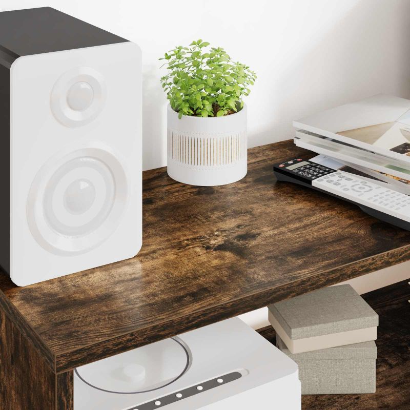 Dieser TV-Schrank kombiniert Style und Funktion. Mit seiner schlanken Form passt er super in jedes moderne Wohnzimmer und hat viel Platz für Medien und Co. Er ist nicht nur praktisch, sondern auch ein echter Hingucker in deinem Unterhaltungsbereich, der sich problemlos in deine gesamte Wohnraumgestaltung einfügt. Materialien: Der Schrank ist aus Holzwerkstoff gebaut und hat einen stabilen Rahmen. Die hochwertige Holztextur bringt Eleganz und macht ihn robust genug für den täglichen Einsatz, ideal für Haushalte mit vielen Gästen oder aktiven Kids und Tieren. Eingeschlossene Komponenten: Mit praktischen Regalbrettern bietet er eine einfache Möglichkeit, verschiedene Geräte und Dekos zu ordnen. Jedes Regal ist stabil und hält auch schwere Geräte wie Fernseher oder Musikanlagen aus, was ihn perfekt für Technik-Liebhaber macht. Funktionen / Design: Der TV-Schrank hat klare Linien und ein minimalistisches Design, das einen entspannten Look schafft. Seine flache Bauweise passt hervorragend in kleine Räume, ohne das Gesamtbild zu überlagern. Empfohlene Verwendung: Super für dein Wohnzimmer! Dieser Schrank kann als zentrales Medienzentrum fungieren, das problemlos einen Flachbildfernseher und verschiedene Unterhaltungssysteme unterbringt. Er hat vielseitige Einsatzmöglichkeiten und bringt eine gemütliche Atmosphäre, während Ordnung im Vordergrund bleibt. Pflege & Wartung: Um lange Freude an deinem Schrank zu haben, vermeide scharfe Chemikalien und wische ihn einfach mit einem feuchten Tuch ab. Die Montage erfolgt nach Anleitung des Herstellers, wobei zwei Personen dafür nötig sind, um einen sicheren Aufbau zu gewährleisten.