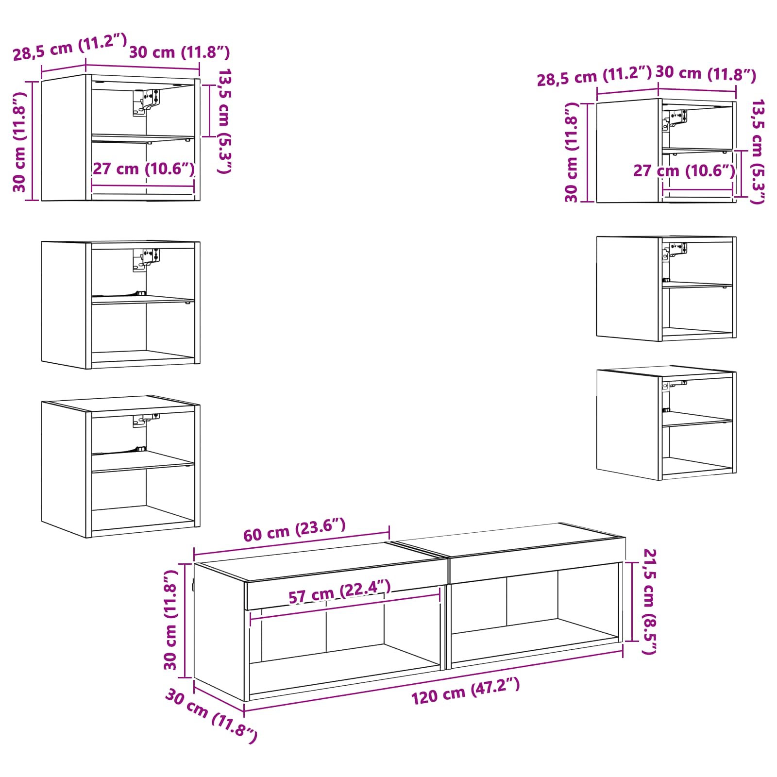 - 6 x Wandregal: 30 x 28,5 x 30 cm (L x B x H)