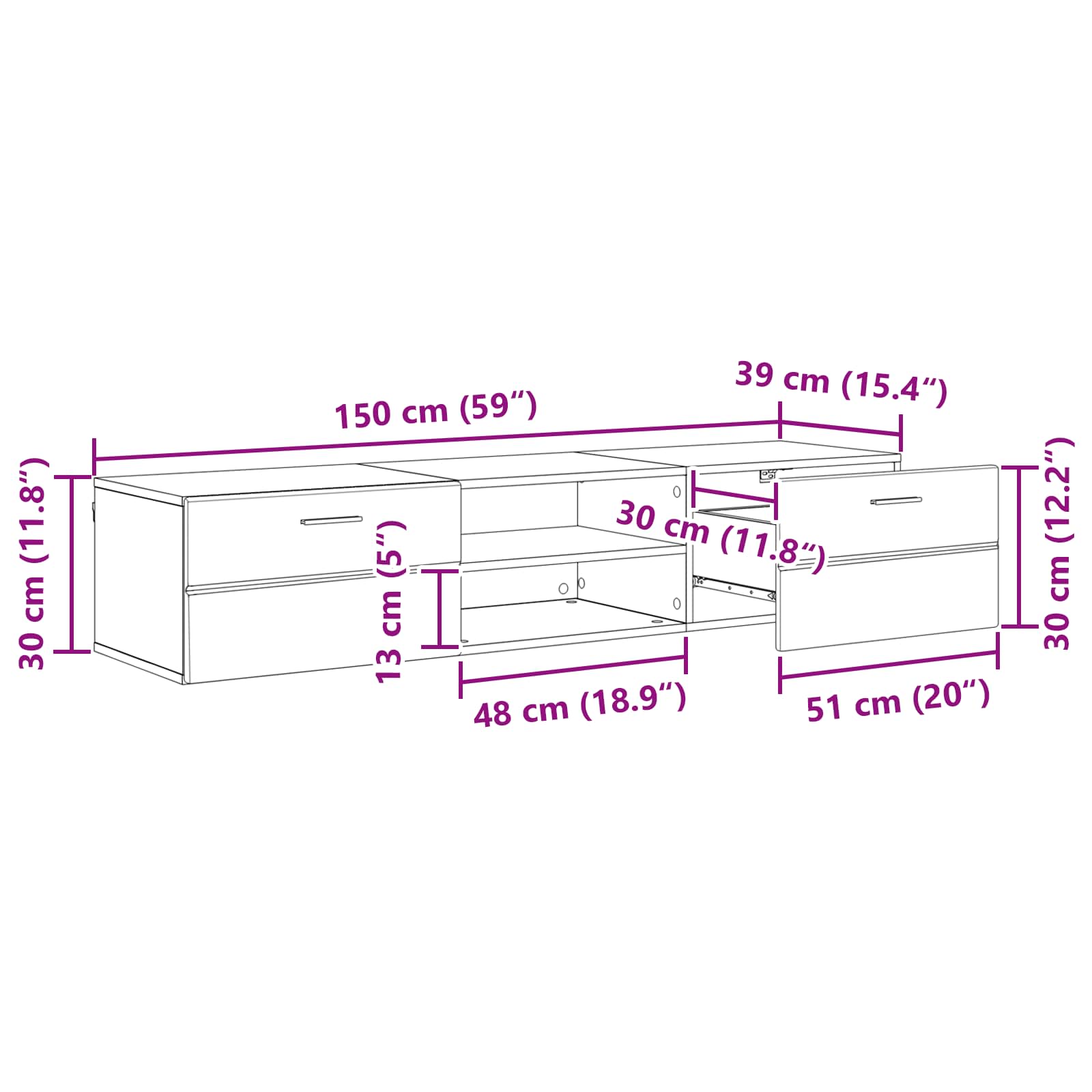 - Gesamtabmessungen: 150 x 39 x 30 cm (L x B x H)