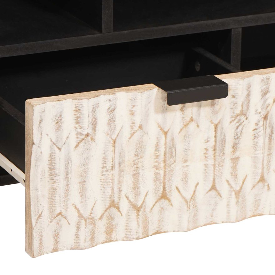 Dieser moderne TV-Schrank ist ein schickes, flaches Möbelstück, das jeden zeitgenössischen Raum aufpeppt. Mit klaren Linien und minimalistischen Design ist er eine stylische und praktische Lösung für die Organisation von Medien und Wohnzimmereinrichtungen. Die Kombination aus solidem Mango-Holz und Holzwerkstoffen gibt ihm Stabilität, während die Eisenbeine einen modernen Akzent setzen. Der Schrank passt super zu verschiedenen Dekor-Stilen und bietet viel Stauraum für Medientechniken auf coole Weise. Schickes Design: Der moderne Stil dieses Schranks zeigt sich in klaren Linien und minimalistischer Ästhetik, die einen vielseitigen und eleganten Look bieten, der in moderne Umgebungen passt. Seine rechteckige Form harmoniert mit verschiedenen Layouts und sorgt für einen ansprechenden Fokus im Raum. Robuste Materialien: Dieser TV-Schrank aus solidem Mango-Holz kombiniert natürliche Schönheit mit langanhaltender Widerstandsfähigkeit. Die Holzwerkstoff verbessert die Stabilität und macht ihn ideal für den täglichen Gebrauch. Die gewählten Materialien sorgen dafür, dass er zu verschiedenen Räumen passt. Praktische Komponenten: Mit Brettern und praktischen Schubladen ist dieses Lowboard darauf ausgelegt, ordentlich Stauraum zu bieten und deinen Wohnbereich aufgeräumt zu halten. Die unterschiedlichen Fächer erleichtern das Organisieren von Mediengeräten, Büchern und Deko. Praktische Maße: Mit den Maßen 100 x 33,5 x 46 cm bietet der Schrank viel Platz für Fernseher, Lautsprecher und mehr. Seine durchdachte Größe macht ihn flexibel für kleine sowie große Wohnzimmer. Montagedetails: Dieser Schrank braucht zwei Personen und einen Schraubendreher für die Montage. Der einfache Aufbau und die gelieferten Teile sorgen für ein stabiles und sicheres Ergebnis für deinen Wohnbereich.