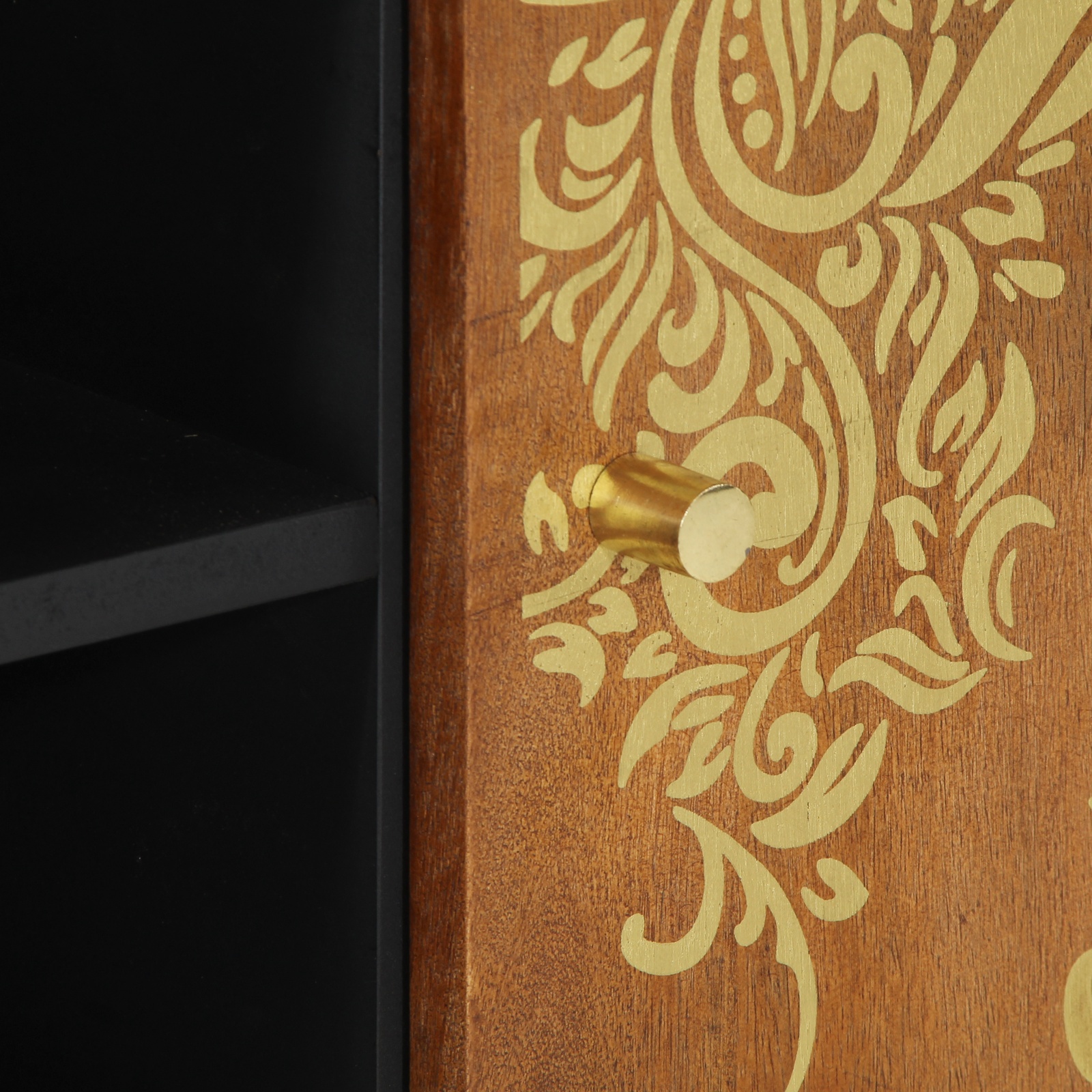 Dieser traditionelle, honigbraune Medienspeicherschrank bringt mit seinem tollen Design und praktischen Funktionen frischen Wind in dein Wohnzimmer. Er kombiniert Stil und Funktionalität perfekt. Organisiere deine Mediengegenstände und genieße die reiche honigbraune Farbe sowie die schönen floralen Akzente, die Ausdruck von Eleganz sind – ideal für alle, die zeitlose Möbel lieben. Coole florale Einlagen: Die hübschen floralen Einlagen auf diesem Medienspeicherschrank sind ein Blickfang für dein Familienzimmer. Diese Details verleihen Tiefe und Charakter, die den traditionellen Stil hervorheben. Ihr filigranes Design zeigt tolle Handwerkskunst und zieht sicher die Blicke deiner Gäste an. Massivholz-Akazien-Bau: Aus robustem massivem Akazienholz gefertigt, steht dieser Schrank für Langlebigkeit und Widerstandsfähigkeit. Das strapazierfähige Material sorgt nicht nur für Stärke, sondern auch für eine warme Ausstrahlung in deinem Raum mit seiner reichen natürlichen Farbe. Er hält bis zu 50 kg aus, ohne an Stabilität zu verlieren. Praktisches Regal: Mit integrierten Regalen gibt dir dieser Schrank einen super Platz zur Organisation von Mediengegenständen, Büchern oder Deko. Jedes Regal ist 70 cm lang und 40 cm breit und bietet Platz, um Sammlerstücke auszustellen. Diese Anordnung optimiert die Effizienz deines Wohnraums. Stilvolle Aufbewahrung: Der Schrank hat Türen mit Scharnieren für einen einfachen Zugang, während das Innere ordentlich versteckt bleibt. So kannst du dekorative Stücke präsentieren, während weniger genutzte Dinge unsichtbar sind. Die sanft gleitenden Türen machen die Benutzung im Alltag einfach. Einfach zu pflegen: Die Pflege dieses Schranks ist kinderleicht; wische ihn einfach regelmäßig mit einem weichen Tuch ab, damit er frisch und sauber aussieht. Verzichte auf scharfe Reinigungsmittel, um die schöne Oberfläche zu erhalten, damit er über Jahre hinweg ein schöner Hingucker in deinem Familienzimmer bleibt.