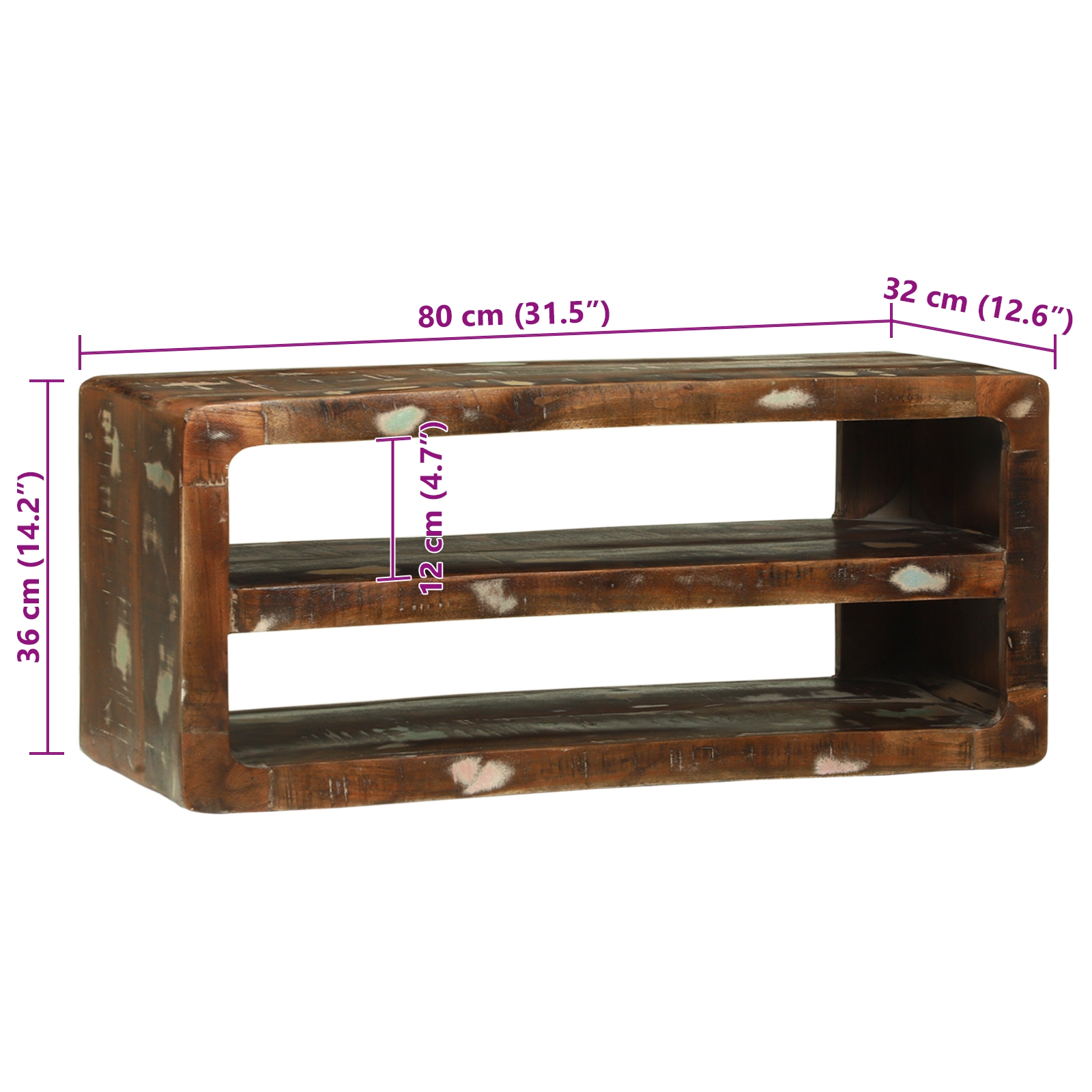 Dieser TV-Schrank ist ein großartiges Stück für jedes Wohnzimmer oder Büro. Er vereint Funktionalität und rustikalen Charme. Hergestellt aus massivem recyceltem Holz, hat er eine schöne, raue Oberfläche, die deinen Raum aufgehellt und ideal ist, um Bücher, Mediengeräte oder Deko zu lagern. Dieser TV-Schrank bietet jede Menge Stauraum, hält deine Medienutensilien organisiert und sorgt dafür, dass dein Wohnraum ordentlich bleibt. Das offene Regal-Design erlaubt schnellen Zugriff auf alles, was du brauchst, perfekt für geschäftige Haushalte. Der massive Aufbau aus recyceltem Holz bedeutet, dass er langlebig ist und einen natürlichen Look hat, der zu verschiedenen Einrichtungsstilen passt. Das rustikale Design lässt jede Ecke einladend aussehen und schafft einen warmen, gemütlichen Raum zum Entspannen oder Unterhalten. Sein einfacher Charme zeigt die einzigartigen Holztexturen und sorgt dafür, dass kein zwei Stücke gleich sind – das verleiht deinem Zuhause einen besonderen Touch. Durchdacht gestaltet, bietet der Schrank einen großartigen Platz für Deko oder Mediaprodukte. Die geräumigen Regale haben Platz für Bücher oder Spielzeug und sind besonders vorteilhaft für Erwachsene, die für Ordnung und Stil in ihren Unterhaltungsbereichen sorgen wollen. Mit Abmessungen von 80 x 32 x 36 cm passt dieser kompakte Schrank hervorragend in kleine Räume und nutzt jeden Zentimeter optimal. Zudem erleichtert das geringe Gewicht die Bewegung und die Anpassung an jede Anordnung. Dieser Mediaschrank hat zwei geräumige Regale aus massivem recyceltem Holz, was ihn stabil für den langfristigen Gebrauch macht. Die abgenutzte Oberfläche bringt rustikalen Charme mit und macht ihn zu einem stilvollen und robusten Teil deines Wohnraums.