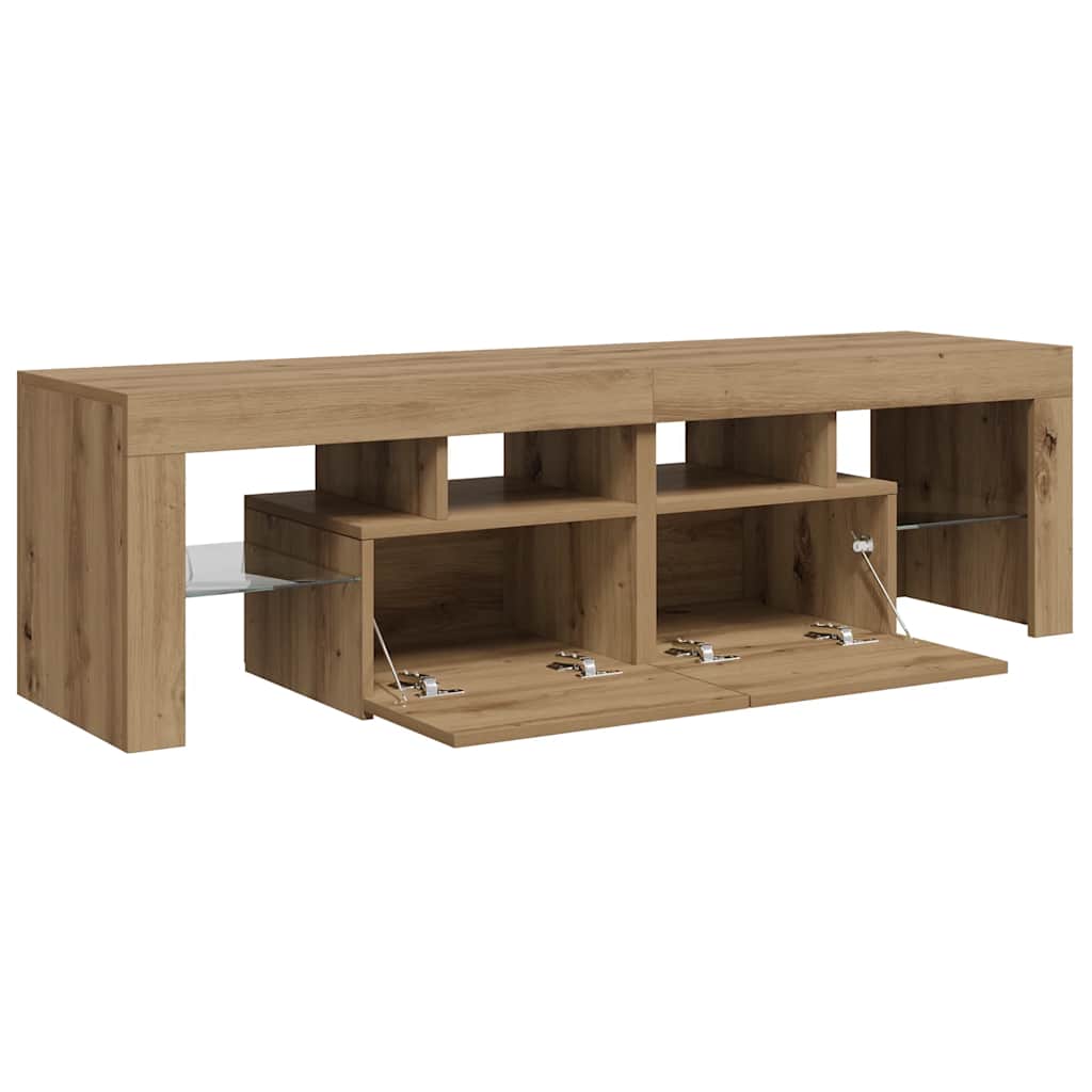 Mit seinem trendigen und dennoch praktischen Design wird dieses robuste TV-Möbel ein echter Hingucker in jedem Zimmer sein.Langlebiges Material: Der Holzwerkstoff ist von außergewöhnlicher Qualität mit glatter Oberfläche und zeichnet sich außerdem durch Festigkeit, Stabilität und Widerstandsfähigkeit gegen Feuchtigkeit aus.RGB-LED-Leuchten: Dieser TV-Ständer ist mit RGB-LED-Leuchten ausgestattet, die über verschiedene Menüs verfügen, um die Farbe der Leuchten zu wechseln und die Farbe automatisch unterschiedlich einzustellen. Die LED-Leuchten unterstreichen den modernen Look und tragen zum trendigen Gefühl bei.Reichlich Stauraum: Dieses TV-Möbel bietet praktischen Stauraum unter der Tischplatte, sodass du kleinere Gegenstände ordentlich aufbewahren kannst.Präsentation: Die Oberplatte der TV-Konsole bietet auch den perfekten Platz für Bilderrahmen, Topfpflanzen und andere Dekoartikel.Gut zu wissen:Das Produkt verfügt über einen USB-Anschluss, für den eine zertifizierte 5V-USB-Stromquelle erforderlich ist (nicht im Lieferumfang enthalten).