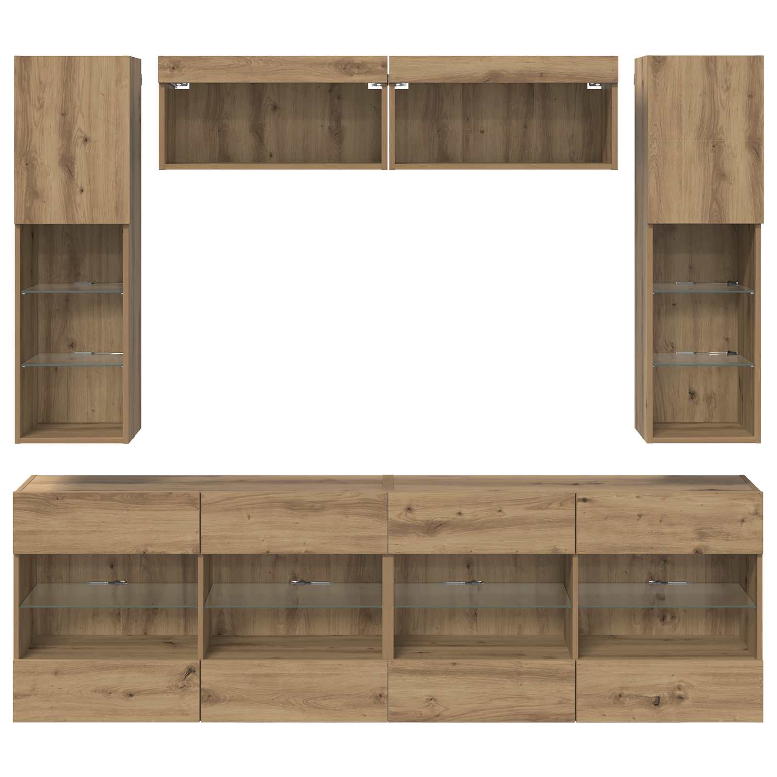 Das moderne TV-Wandregal-Set ist eine fabelhafte, stylische und funktionale Ergänzung für jedes Wohnzimmer. Es kombiniert ein schickes, zeitgenössisches Design mit praktischen Features und macht deinen Unterhaltungsbereich schöner und nutzbarer. Die klaren Linien und der minimalistische Stil bieten einen eleganten Look, der zu modernem Dekor passt und Platz für deinen Fernseher, deine Spielkonsolen und andere Medientechnik schafft, während alles gleichzeitig ordentlich bleibt. Haltbare Materialien: Das TV-Wandregal-Set besteht aus Holzwerkstoff, der für seine Widerstandsfähigkeit bekannt ist. Die schwarze Eichenoberfläche sorgt für einen eleganten Touch und passt super zu vielen Einrichtungsstilen. Holzwerkstoff hält lange und sieht auch nach häufigem Gebrauch gut aus. Fortschrittliche Beleuchtung: Mit der integrierten, anpassbaren RGB-LED-Beleuchtung kannst du die Stimmung in deinem Wohnzimmer gestalten. Egal, ob du bunte Lichteffekte oder eine gemütliche Atmosphäre möchtest, die fernbedienbaren LED-Lichter bieten dir viele Möglichkeiten. Funktionaler Stauraum: Es gibt genügend Stauraum mit der Tür mit Scharnieren und den geräumigen Fächern, die dafür sorgen, dass deine Medienutensilien übersichtlich bleiben. Das wandmontierte Design sorgt für einen aufgeräumten Fußboden, was perfekt für kleine Wohnzimmer oder minimalistische Umgebungen ist. Stilvolle Merkmale: Das moderne Design kombiniert Style und Funktion. Die schlichte rechteckige Form ist ein echter Hingucker im zeitgenössischen Wohnraum und betont sowohl die Funktionalität als auch die Ästhetik. Installationsüberlegungen: Das Regal-Set ist für die Wandmontage gedacht. Achte darauf, die passenden Schrauben und Dübel für deine Wand während der Installation zu verwenden. Es wird empfohlen, das Set zu zweit zu montieren, um eine sichere und stabile Installation zu gewährleisten.