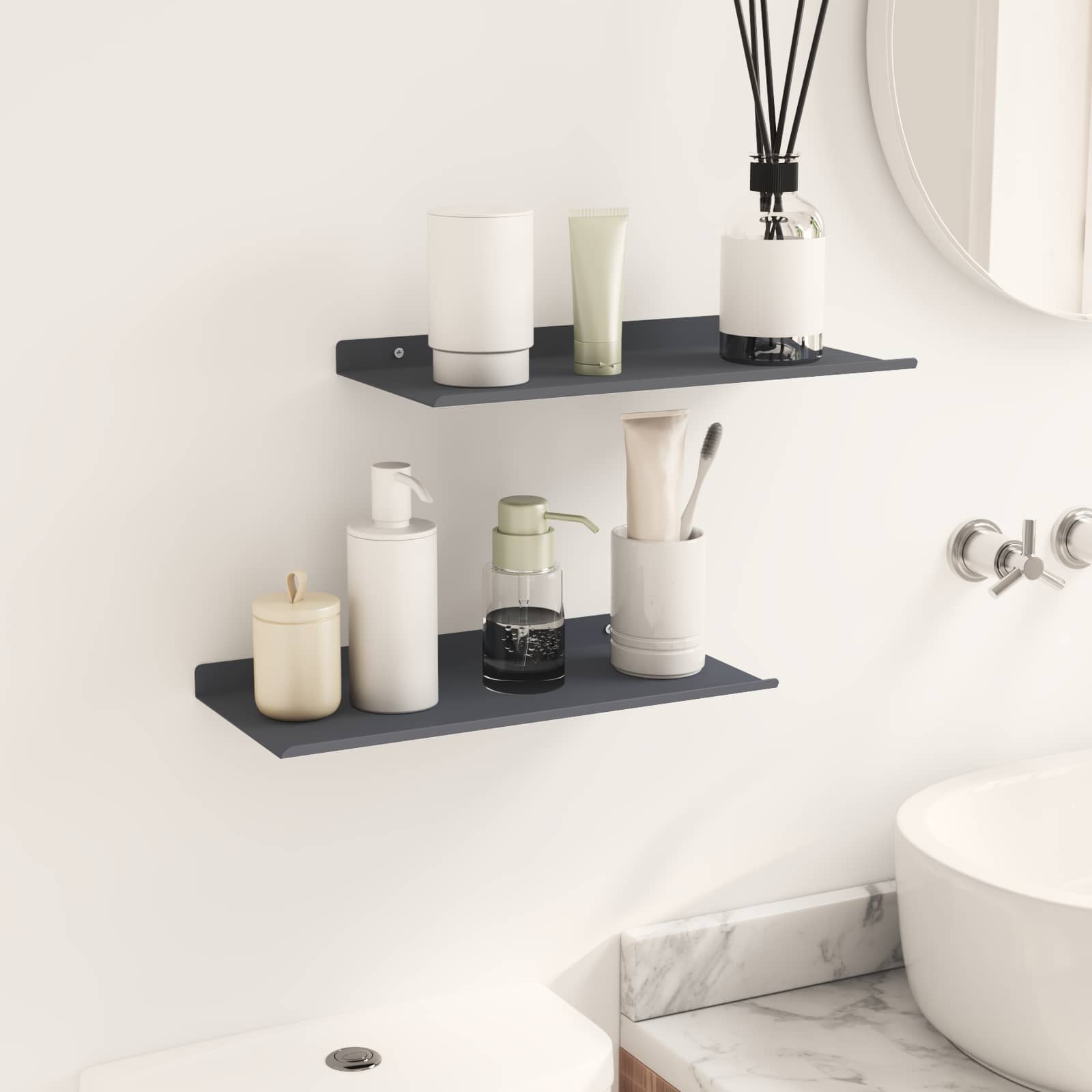 Dieses schlanke Wandregal kombiniert minimalistischen Stil mit modernem Design und ist ein echter Hingucker für jedes Zuhause. Die robuste Stahlkonstruktion und die glatte matte Oberfläche verleihen dem Regal eine elegante Note und gleichzeitig eine vielseitige Aufbewahrungslösung. Ideal für kleine Räume, hilft es den Nutzern, ihre Einrichtung zu verbessern, indem es den perfekten Platz für die Präsentation geliebter Dinge bietet. Ob im Wohnzimmer, Bad oder in der Küche – dieses praktische Regal peppt jedes Ambiente auf und verleiht ihm eine persönliche Note. Matte Stahlkonstruktion Das Wandregal besteht aus hochwertigem Stahl und bietet eine robuste und langlebige Struktur, die täglichen Belastungen standhält, ohne dabei an Style zu verlieren. Die matte Oberfläche schafft einen modernen Look und sorgt für eine glatte, nicht reflektierende Fläche, die sich super in zeitgenössische Interieurs integriert. Wandmontiertes Design Dieses Regal ist praktisch konzipiert und spart wertvollen Platz auf dem Boden, während es genug Stauraum bietet. Ideal für viele Räume, von Wohnbereichen bis hin zu Küchen, schafft es ein ordentliches und stilvolles Zuhause. Einfache Installation Das mitgelieferte Zubehör macht die Montage mit einfachen Haushaltswerkzeugen kinderleicht. Es wird empfohlen, zu zweit zu arbeiten, um sicherzustellen, dass das Regal fest sitzt, sodass du schnell und effizient dein gewünschtes Layout gestalten kannst. Vielseitige Nutzung Dieses Regal mit erhöhten Kanten ist perfekt für verschiedene Szenarien und eignet sich zur Ablage von Büchern, Vasen oder Toilettenartikeln. Regelmäßiges Abstauben mit einem feuchten Tuch hält das Regal frisch und sauber, ohne aggressive Reiniger zu benutzen, was es zu einem unauffälligen, aber effektiven Accessoire für dein Zuhause macht. Mühelose Pflege Die Pflege des eleganten Wandregals ist super einfach: Wische einfach ab, um Staub zu entfernen, und vermeide aggressive chemische Reinigungsmittel, um die Oberfläche zu schonen. Diese einfache Pflege-Routine sorgt für langfristige Freude und frisches Aussehen.