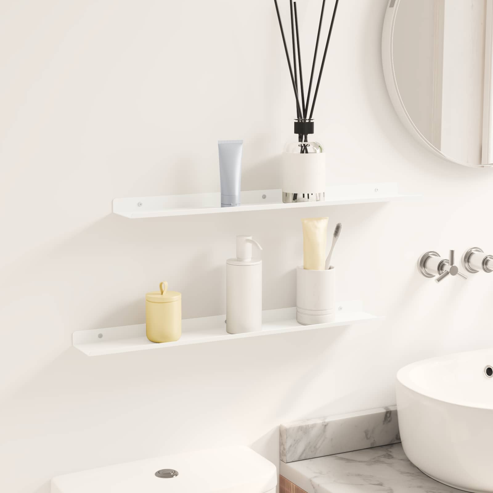 Dieses schlanke Wandregal kombiniert minimalistischen Stil mit modernem Design und ist ein echter Hingucker für jedes Zuhause. Die robuste Stahlkonstruktion und die glatte matte Oberfläche verleihen dem Regal eine elegante Note und gleichzeitig eine vielseitige Aufbewahrungslösung. Ideal für kleine Räume, hilft es den Nutzern, ihre Einrichtung zu verbessern, indem es den perfekten Platz für die Präsentation geliebter Dinge bietet. Ob im Wohnzimmer, Bad oder in der Küche – dieses praktische Regal peppt jedes Ambiente auf und verleiht ihm eine persönliche Note. Matte Stahlkonstruktion Das Wandregal besteht aus hochwertigem Stahl und bietet eine robuste und langlebige Struktur, die täglichen Belastungen standhält, ohne dabei an Style zu verlieren. Die matte Oberfläche schafft einen modernen Look und sorgt für eine glatte, nicht reflektierende Fläche, die sich super in zeitgenössische Interieurs integriert. Wandmontiertes Design Dieses Regal ist praktisch konzipiert und spart wertvollen Platz auf dem Boden, während es genug Stauraum bietet. Ideal für viele Räume, von Wohnbereichen bis hin zu Küchen, schafft es ein ordentliches und stilvolles Zuhause. Einfache Installation Das mitgelieferte Zubehör macht die Montage mit einfachen Haushaltswerkzeugen kinderleicht. Es wird empfohlen, zu zweit zu arbeiten, um sicherzustellen, dass das Regal fest sitzt, sodass du schnell und effizient dein gewünschtes Layout gestalten kannst. Vielseitige Nutzung Dieses Regal mit erhöhten Kanten ist perfekt für verschiedene Szenarien und eignet sich zur Ablage von Büchern, Vasen oder Toilettenartikeln. Regelmäßiges Abstauben mit einem feuchten Tuch hält das Regal frisch und sauber, ohne aggressive Reiniger zu benutzen, was es zu einem unauffälligen, aber effektiven Accessoire für dein Zuhause macht. Mühelose Pflege Die Pflege des eleganten Wandregals ist super einfach: Wische einfach ab, um Staub zu entfernen, und vermeide aggressive chemische Reinigungsmittel, um die Oberfläche zu schonen. Diese einfache Pflege-Routine sorgt für langfristige Freude und frisches Aussehen.