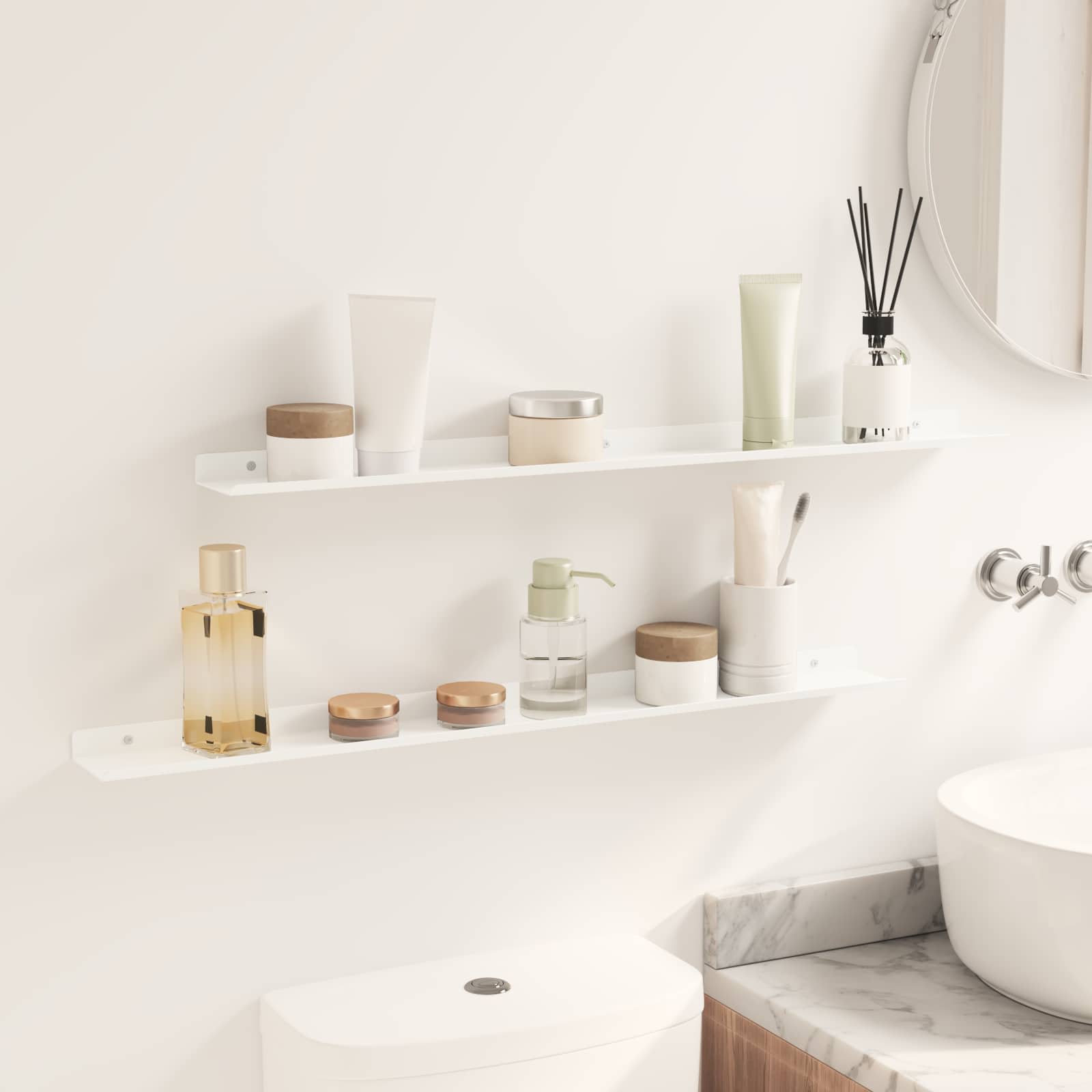 Dieses schlanke Wandregal kombiniert minimalistischen Stil mit modernem Design und ist ein echter Hingucker für jedes Zuhause. Die robuste Stahlkonstruktion und die glatte matte Oberfläche verleihen dem Regal eine elegante Note und gleichzeitig eine vielseitige Aufbewahrungslösung. Ideal für kleine Räume, hilft es den Nutzern, ihre Einrichtung zu verbessern, indem es den perfekten Platz für die Präsentation geliebter Dinge bietet. Ob im Wohnzimmer, Bad oder in der Küche – dieses praktische Regal peppt jedes Ambiente auf und verleiht ihm eine persönliche Note. Matte Stahlkonstruktion Das Wandregal besteht aus hochwertigem Stahl und bietet eine robuste und langlebige Struktur, die täglichen Belastungen standhält, ohne dabei an Style zu verlieren. Die matte Oberfläche schafft einen modernen Look und sorgt für eine glatte, nicht reflektierende Fläche, die sich super in zeitgenössische Interieurs integriert. Wandmontiertes Design Dieses Regal ist praktisch konzipiert und spart wertvollen Platz auf dem Boden, während es genug Stauraum bietet. Ideal für viele Räume, von Wohnbereichen bis hin zu Küchen, schafft es ein ordentliches und stilvolles Zuhause. Einfache Installation Das mitgelieferte Zubehör macht die Montage mit einfachen Haushaltswerkzeugen kinderleicht. Es wird empfohlen, zu zweit zu arbeiten, um sicherzustellen, dass das Regal fest sitzt, sodass du schnell und effizient dein gewünschtes Layout gestalten kannst. Vielseitige Nutzung Dieses Regal mit erhöhten Kanten ist perfekt für verschiedene Szenarien und eignet sich zur Ablage von Büchern, Vasen oder Toilettenartikeln. Regelmäßiges Abstauben mit einem feuchten Tuch hält das Regal frisch und sauber, ohne aggressive Reiniger zu benutzen, was es zu einem unauffälligen, aber effektiven Accessoire für dein Zuhause macht. Mühelose Pflege Die Pflege des eleganten Wandregals ist super einfach: Wische einfach ab, um Staub zu entfernen, und vermeide aggressive chemische Reinigungsmittel, um die Oberfläche zu schonen. Diese einfache Pflege-Routine sorgt für langfristige Freude und frisches Aussehen.