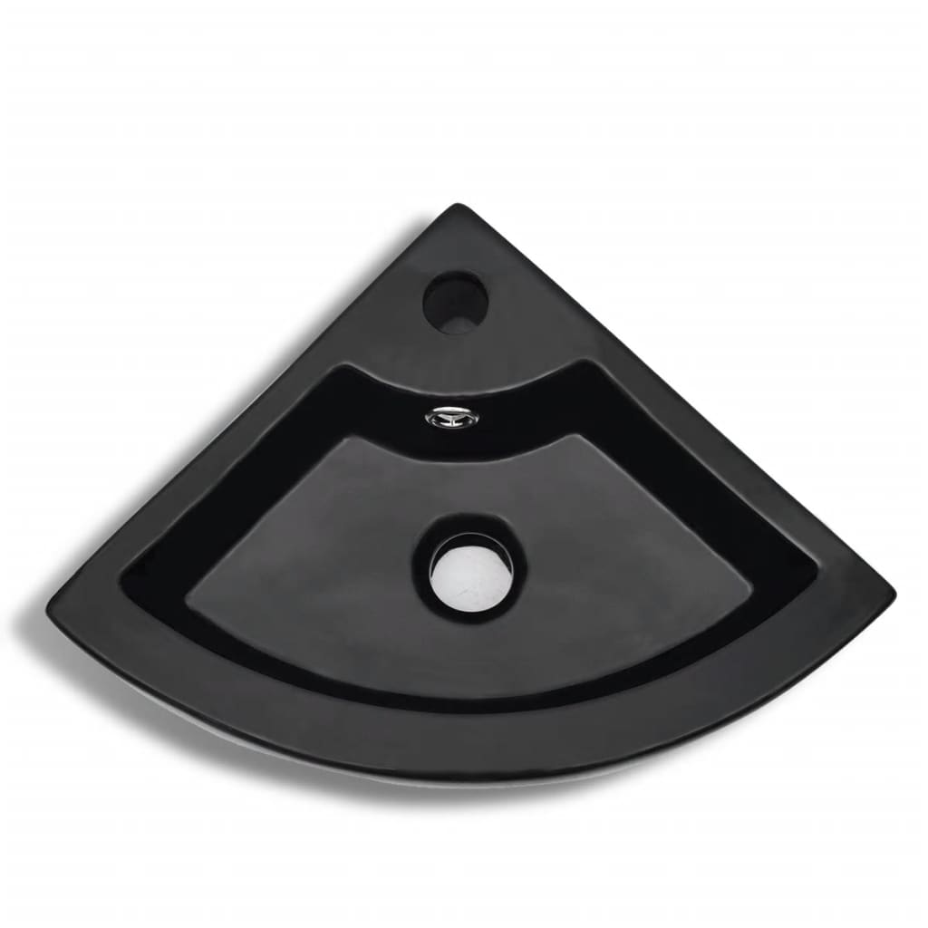 Dieses aus Keramik gefertigte Eckwaschbecken stellt eine schicke und zeitlose Bereicherung für jedes Badezimmer, jeden Waschraum bzw. Schminkraum dar. Dieses Waschbecken dient nicht nur als Becken zum täglichen Gebrauch, sondern stellt auch eine Dekoration in Ihrem Wohnraum dar. Durch sein trendsetzendes und modernes Design mit einer schwarzglänzenden Farbe passt dieses Waschbecken ganz bestimmt zu jeder Inneneinrichtung. Aus Keramik gefertigt, lässt sich das Becken auch ganz einfach reinigen. Darüber hinaus verleiht das Hochglanz-Finish dem Waschbecken eine charmante Note. Ausgestattet mit Überlaufschutz, wird Wasser abfließen, wenn das Becken überfüllt wird. Das Becken ist auch mit einem Wasserhahnloch zur Montage eines Hahns versehen. Bitte beachten Sie, dass der Wasserhahn und die Armatur nicht im Lieferumfang enthalten sind.