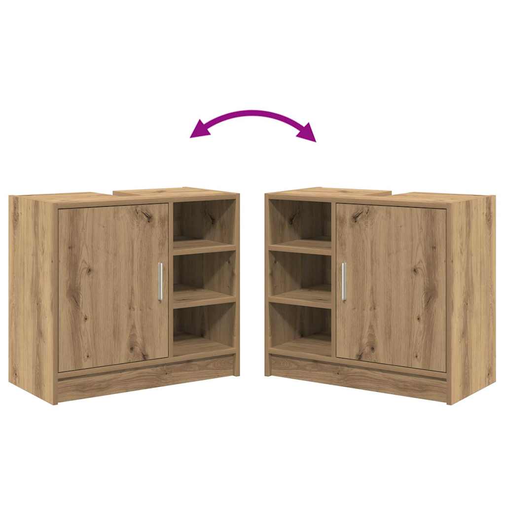 Dieser Waschbecken-Schrank ist eine stylische Ergänzung für dein Badezimmer. Er verbindet modernes Design mit nützlichem Stauraum. Die Bauweise ist aus Holzwerkstoff und hat eine glatte artisan Eichenoberfläche, die deinem Raum Klasse verleiht und den Platz optimal nutzt. Modernes Design: Das matte Finish des Schranks macht ihn zu einem echten Hingucker in deinem Badezimmer und passt gut zu vielen Deko-Stilen. Viel Stauraum: Der Schrank hat drei Regale und eine Tür mit Scharnieren, die viel Platz für deine Badezimmerutensilien bieten und alles ordentlich und griffbereit halten. Stabile Bauweise: Aus massivem Eichenholz gefertigt, hält dieser Schrank echt lange und ist eine zuverlässige Wahl für jedes Badezimmer. Einfach zu reinigen: Den Schrank sauber zu halten ist super einfach; einfach mit einem trockenen Tuch abwischen. So bleibt mehr Zeit, dein ordentliches Badezimmer zu genießen. Vielseitige Nutzung: Der Waschbecken-Schrank passt super ins Badezimmer, aber auch in Waschküchen oder Nebenräume, und zeigt, dass er anpassungsfähig ist und gut aussieht.