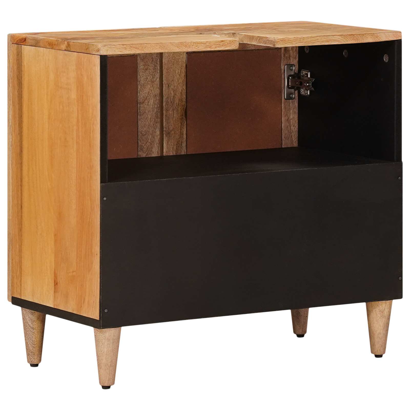 Hier haben wir einen sorgfältig gefertigten Waschbecken-Schrank fürs Bad, der die Ästhetik und Funktionalität modernster Badezimmer steigert. Perfekt für verschiedene Bad-Stile, verkörpert dieses elegante Teil Einfachheit und modernen Chic. Die Kombination aus solidem Mango-Holz und Metall ist nicht nur toll anzusehen, sondern bringt auch eine warme Atmosphäre in dein Bad. Stell dir einen ordentlichen Raum vor, in dem alles Wichtige griffbereit ist und der deinem Alltag einen Hauch von Raffinesse verleiht. Massivholz Mango: Der Schrank aus massivem Mango-Holz ist super langlebig und robust. Die natürliche Holzmaserung gibt ihm einen einzigartigen Charakter und bringt Wärme und Eleganz ins Bad. Das Material sorgt für Qualität, die lange hält. Metallbeine: Auf stabilen, schwarz lackierten Metallbeinen steht der Schrank sicher. Diese Beine geben nicht nur Stabilität, sondern setzen auch einen modernen Akzent, der das Badezimmer aufpeppt. Sie sind so robust, dass der Schrank ewig hält und zeigen seinen Stil und seine Funktionalität. Geräumiger Innenraum: Dieses Design bietet viel Platz hinter den Türen. Das sorgt für Ordnung, ermöglicht schnellen Zugriff auf notwendige Dinge und hält alles sauber. Es wurde so angeschafft, dass viele Gegenstände Platz finden und der Raum optimal genutzt wird. Modernes Äußeres: Profitiere von einem minimalistischen Look mit den schlichten Linien dieses Schranks. Ideal für jeden, der auf Einfachheit und Funktionalität steht, hebt er das Ambiente in jedem modernen Badezimmer hervor und gibt ihm Charme. Pflege und Wartung: Um den Schrank in einem Top-Zustand zu halten, musst du einfach wenig tun. Wische die Oberfläche mit einem feuchten Tuch ab und halte sie frisch, damit das Teil lange gut aussieht. Diese einfache Pflege ist perfekt für alle, die eine stressfreie Lösung wollen.