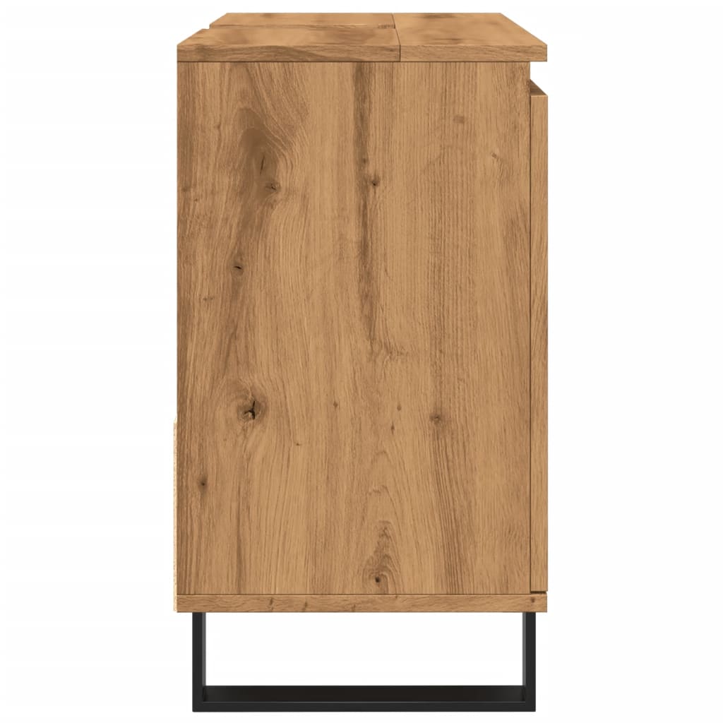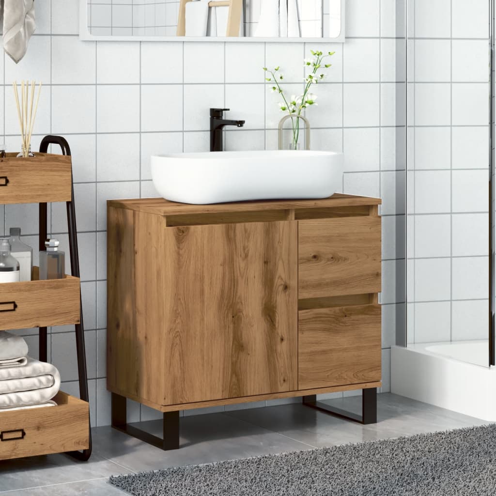 Dieser Waschbeckenunterschrank ist eine hervorragende Bereicherung für dein Badezimmer und verleiht ihm eine aufgeräumte und markante Optik! Langlebiges Material: Holzwerkstoff ist ein Material außergewöhnlicher Qualität mit glatter Oberfläche. Er zeichnet sich durch Festigkeit, Stabilität und Feuchtigkeitsbeständigkeit aus.Reichlich Stauraum: Der Waschbeckenschrank bietet reichlich Platz, um wichtigste Toilettenartikel und Badutensilien wie Seife, Shampoo, Zahnpasta usw. zu verstauen.Platzsparendes Design: Die Oberplatte des Badschranks bietet den idealen Platz für das Waschbecken. So kannst du auch den freien Platz unter dem Waschbecken optimal ausnutzen.Eisen-Beine: Die Beine aus Eisen verleihen dem Unterschrank eine industrielle Note und sorgen gleichzeitig für die Stabilität des Waschtisches. Achtung:Um ein Umkippen zu vermeiden, sollte dieses Produkt mit der mitgelieferten Wandhalterung gesichert werden.